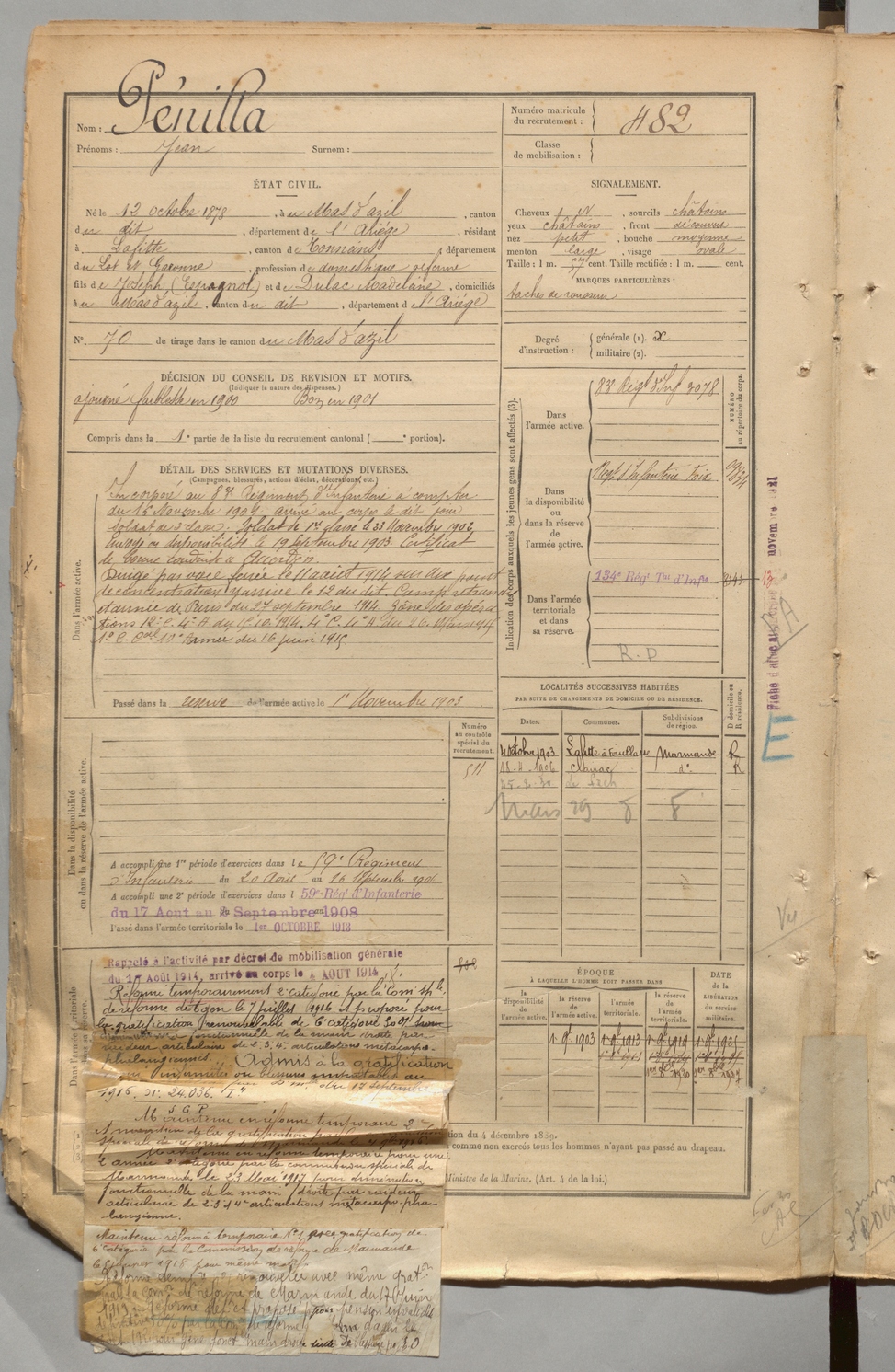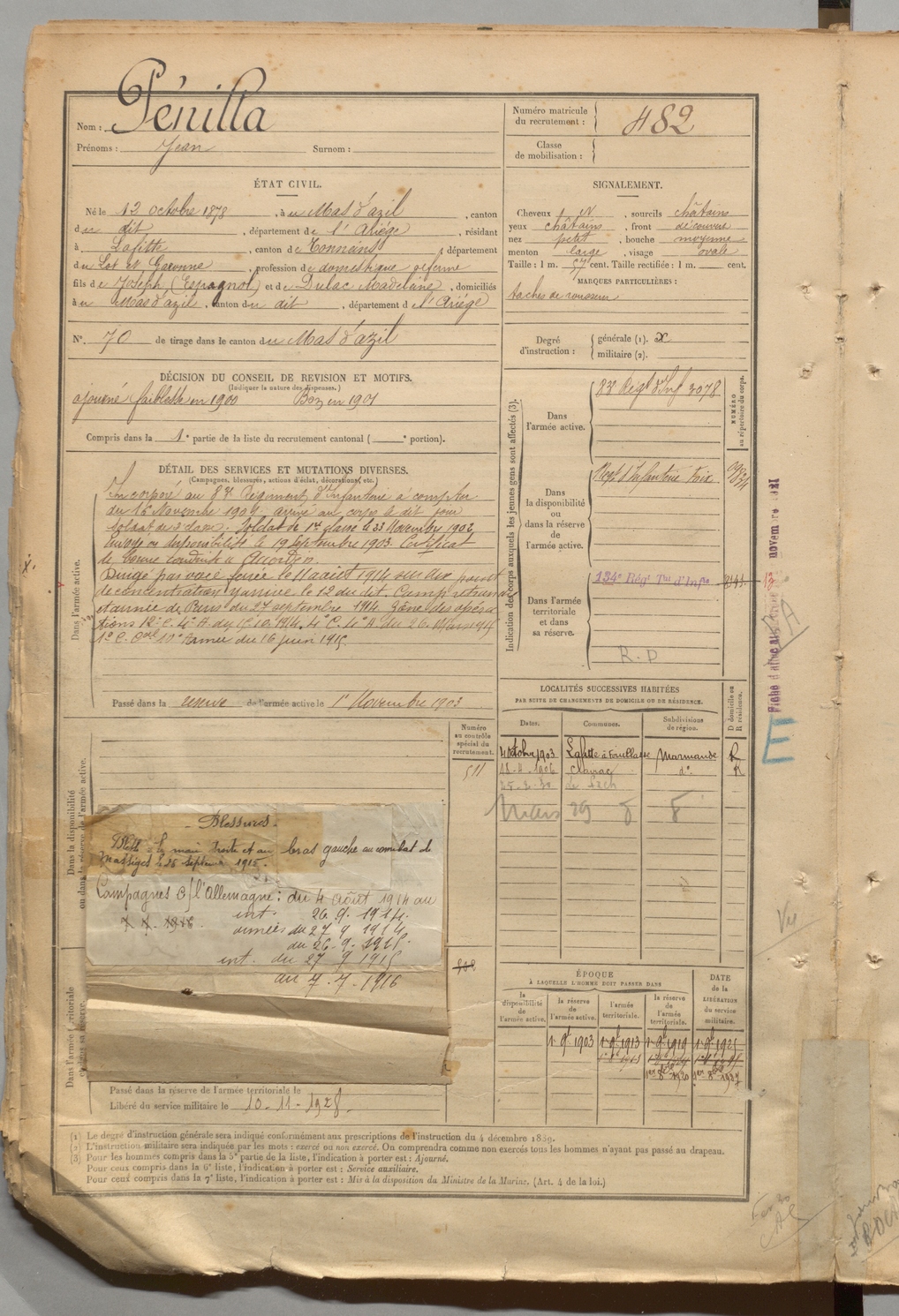| Pénilla | Jean | FOIX | 1 R 457 | 1899 | Mas-d'Azil (Le) | Lafitte | 482 |