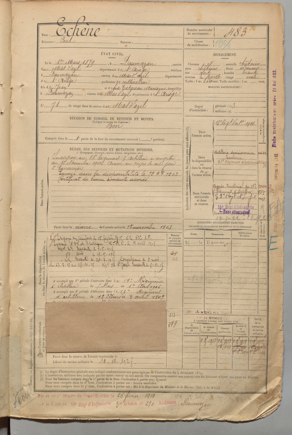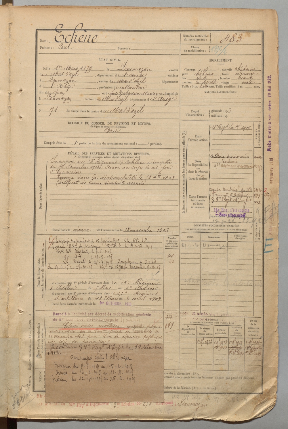 | Echène | Paul | FOIX | 1 R 457 | 1899 | Daumazan | Daumazan | 483 |