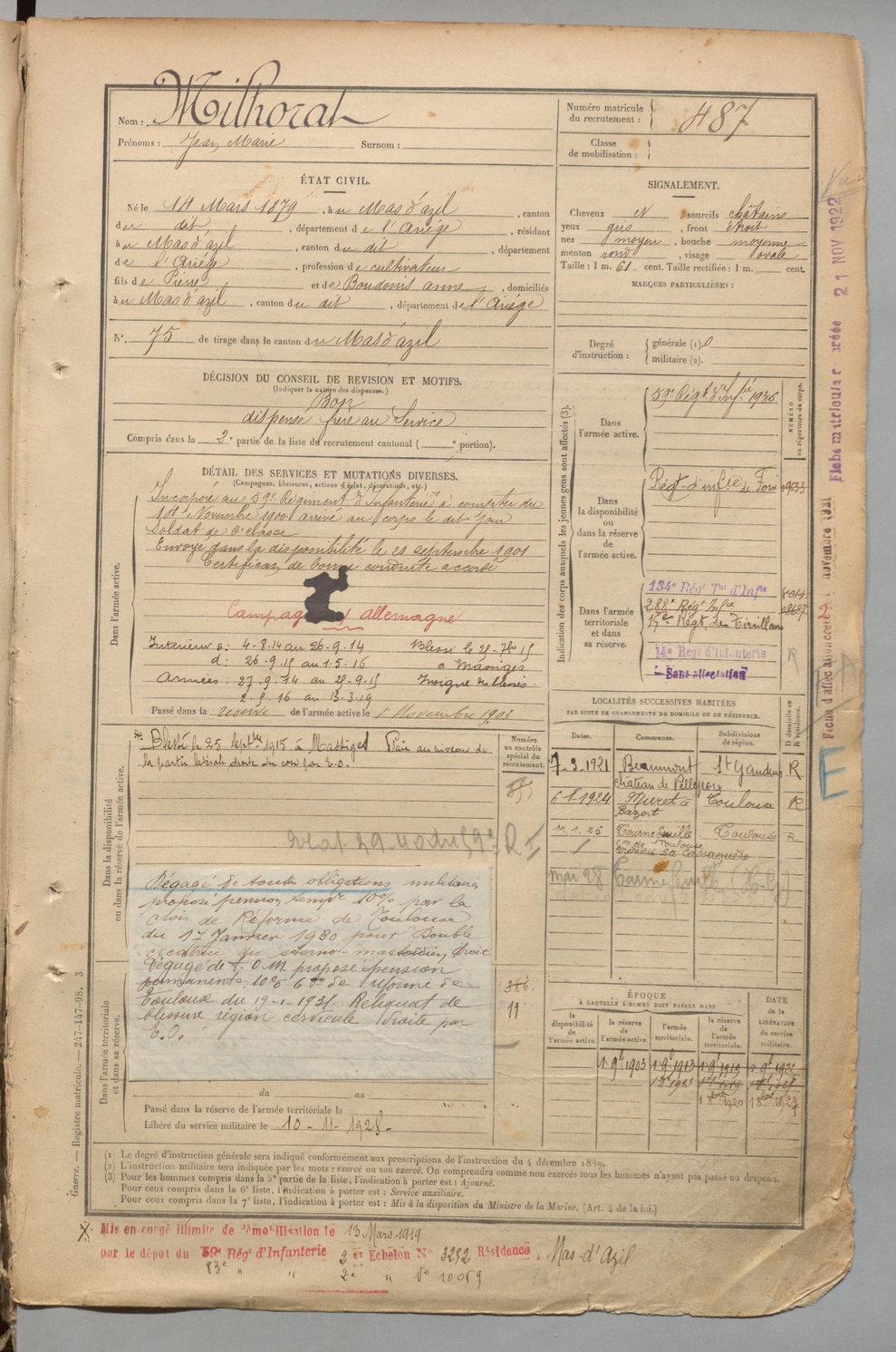 | Milhorat | Jean Marie | FOIX | 1 R 457 | 1899 | Mas-d'Azil (Le) | Mas-d'Azil (Le) | 487 |