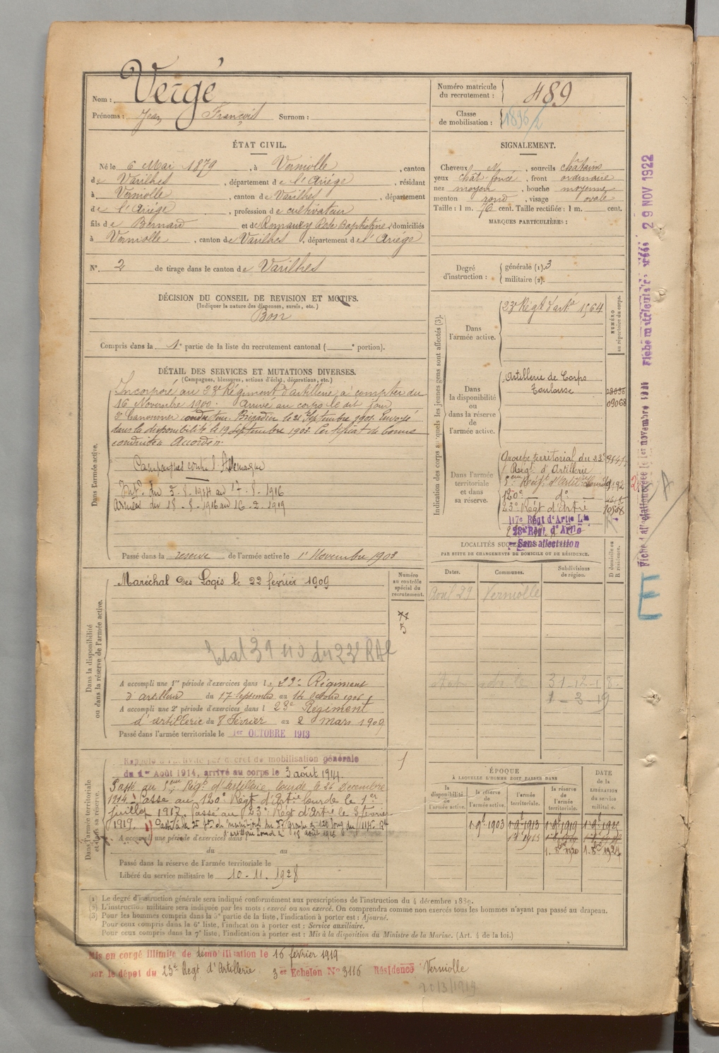 | Vergé | Jean François | FOIX | 1 R 457 | 1899 | Verniolle | Verniolle | 489 |
