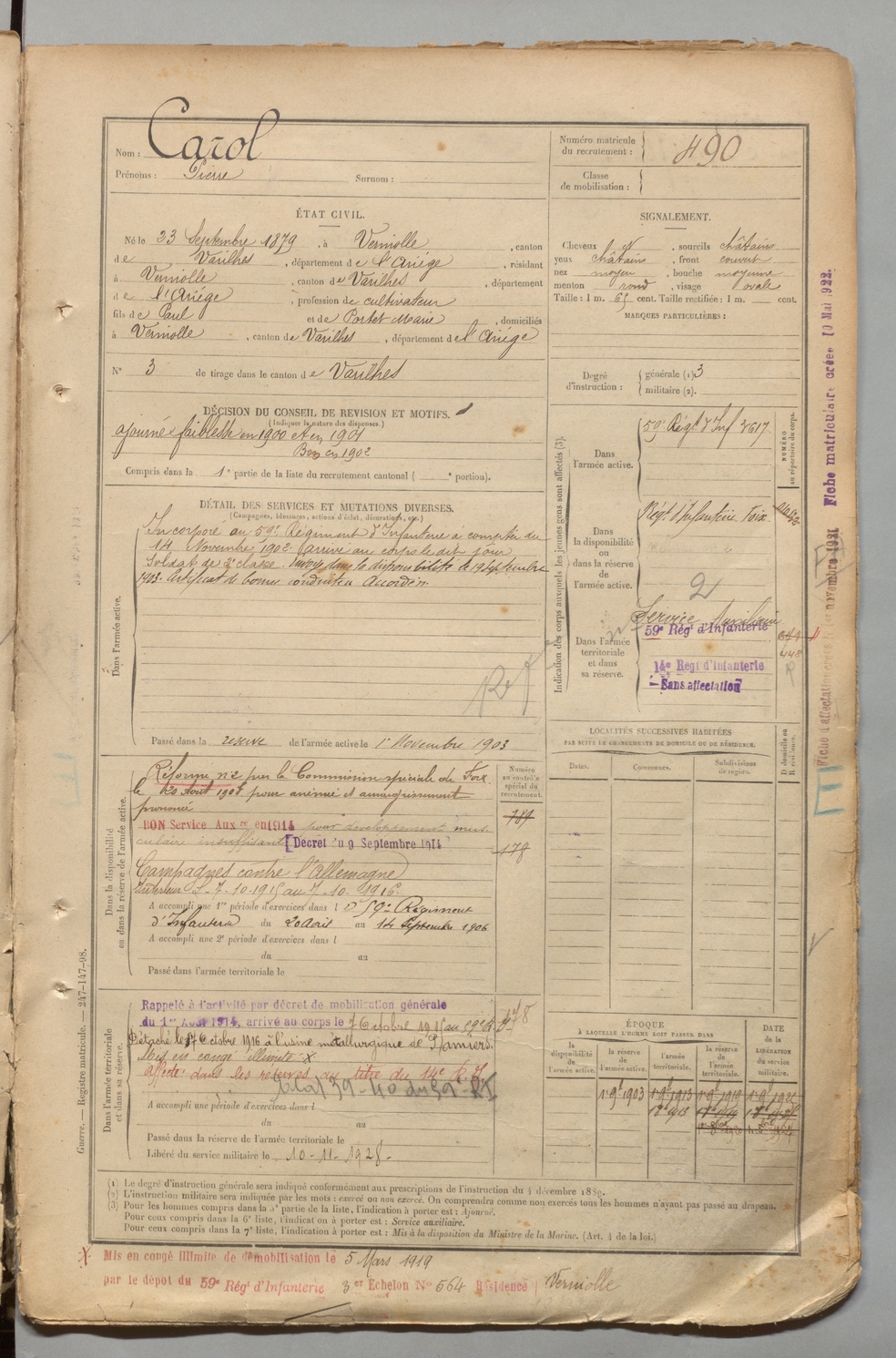 | Carol | Pierre | FOIX | 1 R 457 | 1899 | Verniolle | Verniolle | 490 |