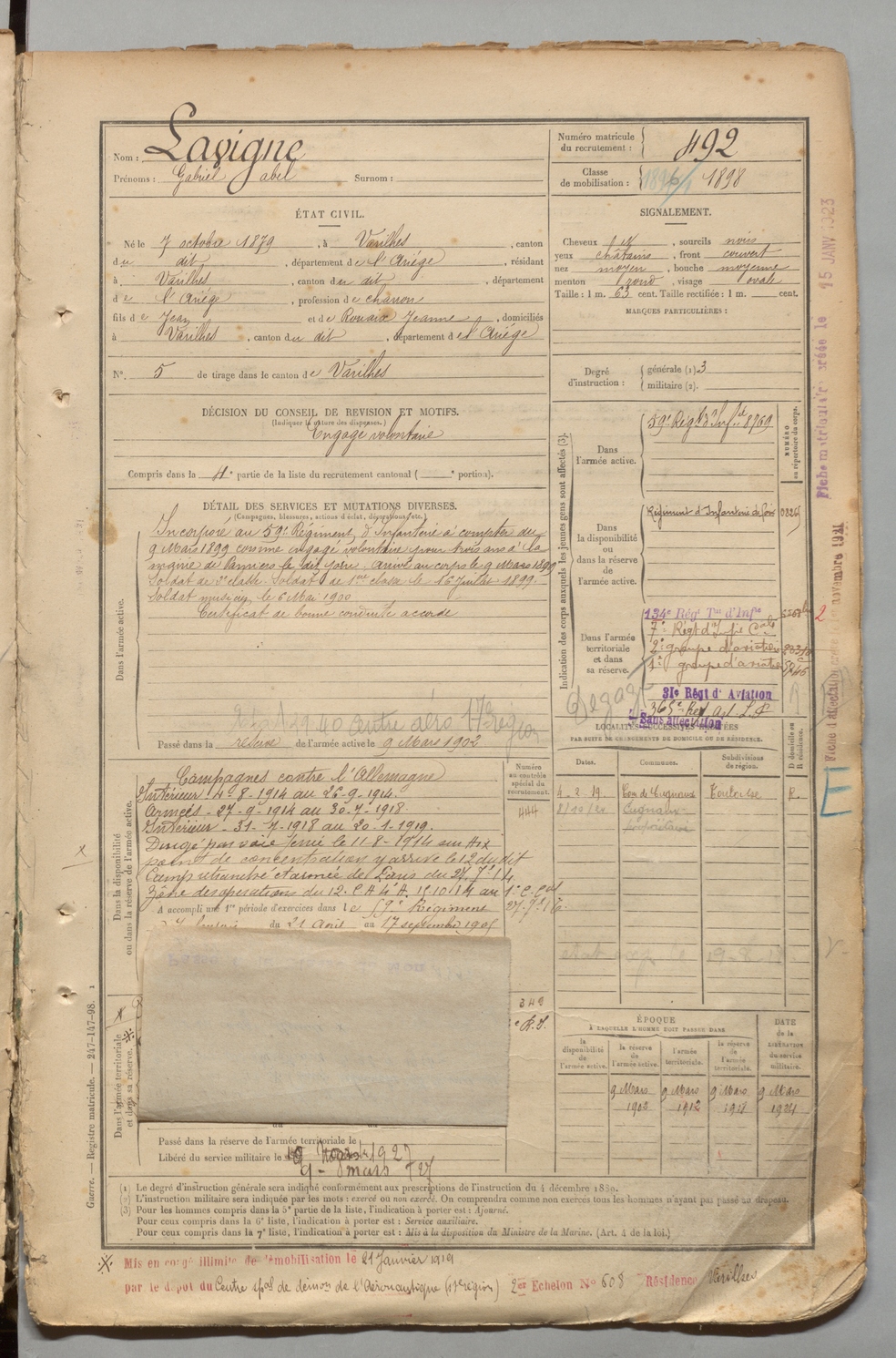 | Lavigne | Gabriel Abel | FOIX | 1 R 457 | 1899 | Varilhes | Varilhes | 492 |