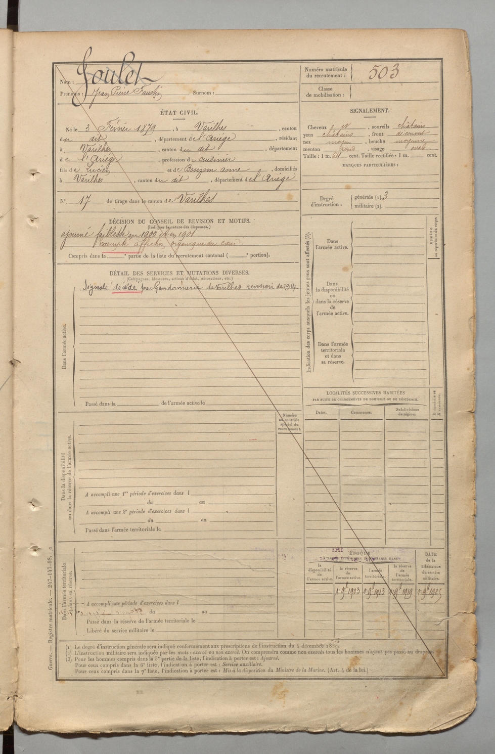 | Joulet | Jean Pierre Faustin | FOIX | 1 R 457 | 1899 | Varilhes | Varilhes | 503 |