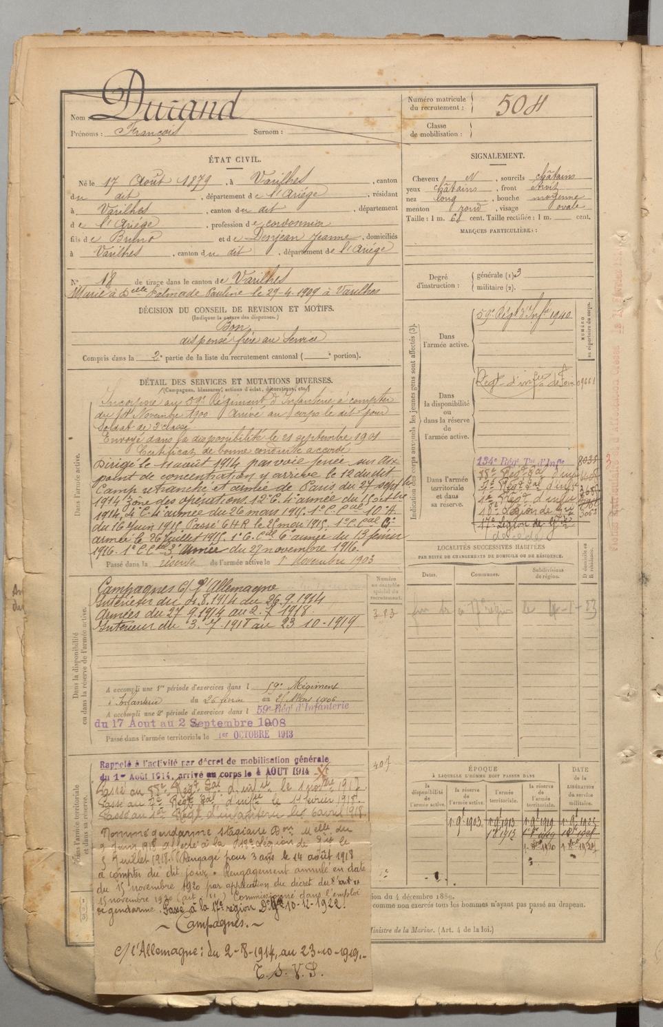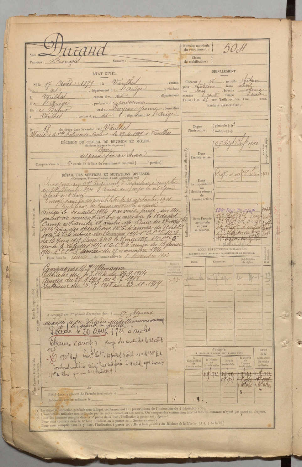 | Durand | François | FOIX | 1 R 457 | 1899 | Varilhes | Varilhes | 504 |