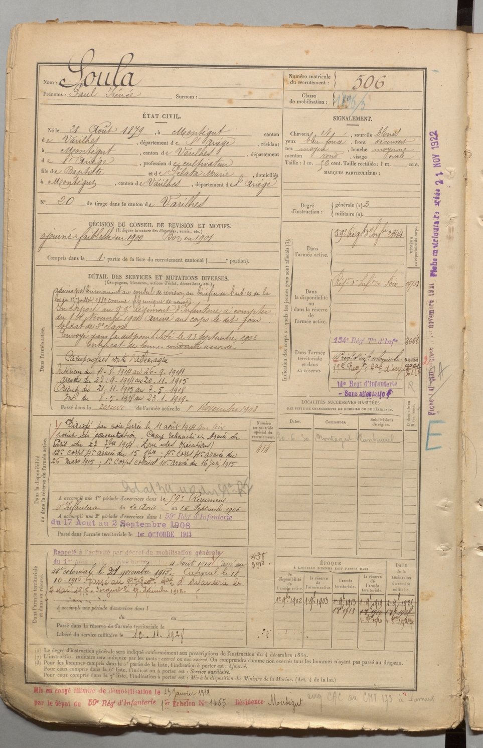 | Soula | Paul Irénée | FOIX | 1 R 457 | 1899 | Montégut-Plantaurel | Montégut-Plantaurel | 506 |