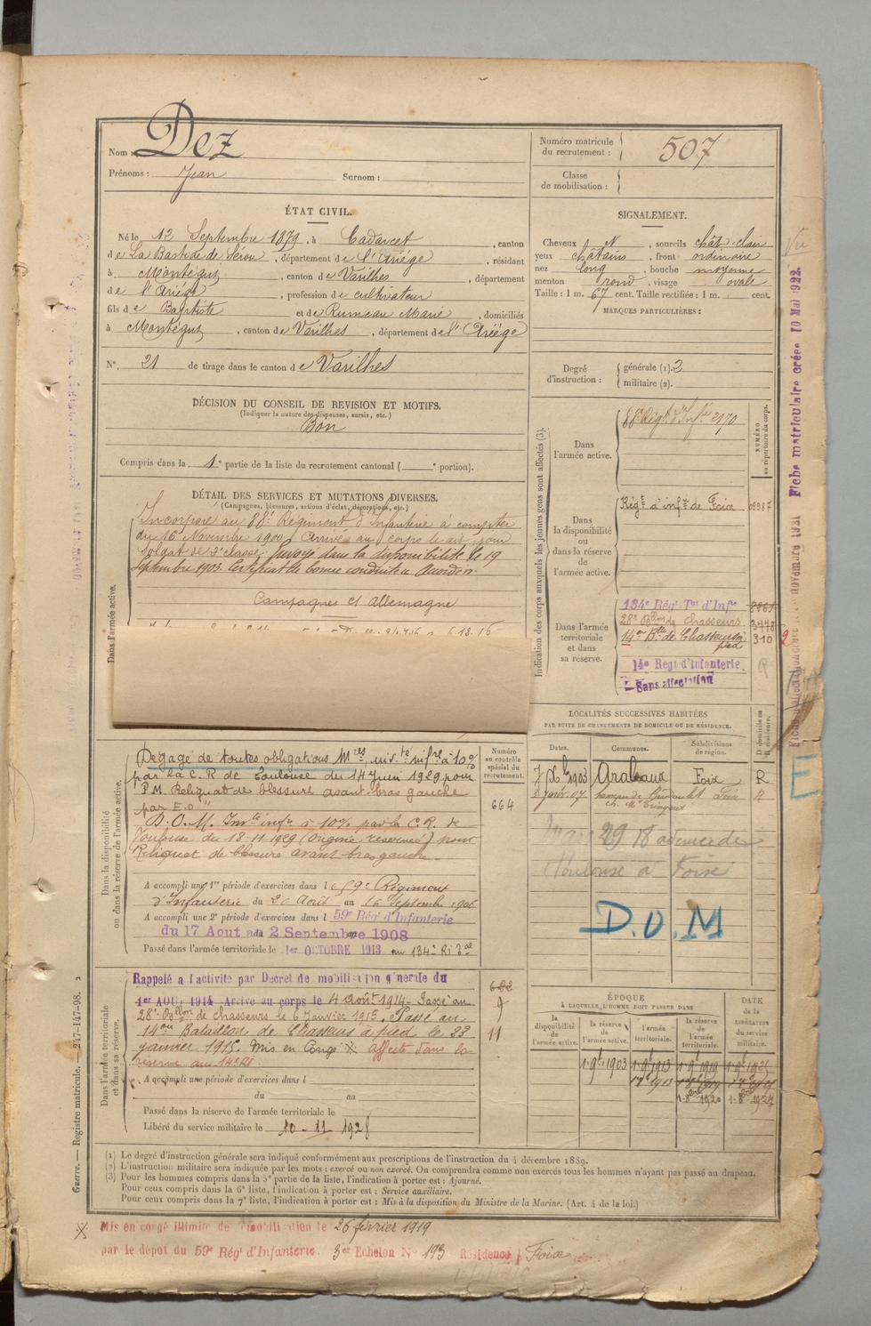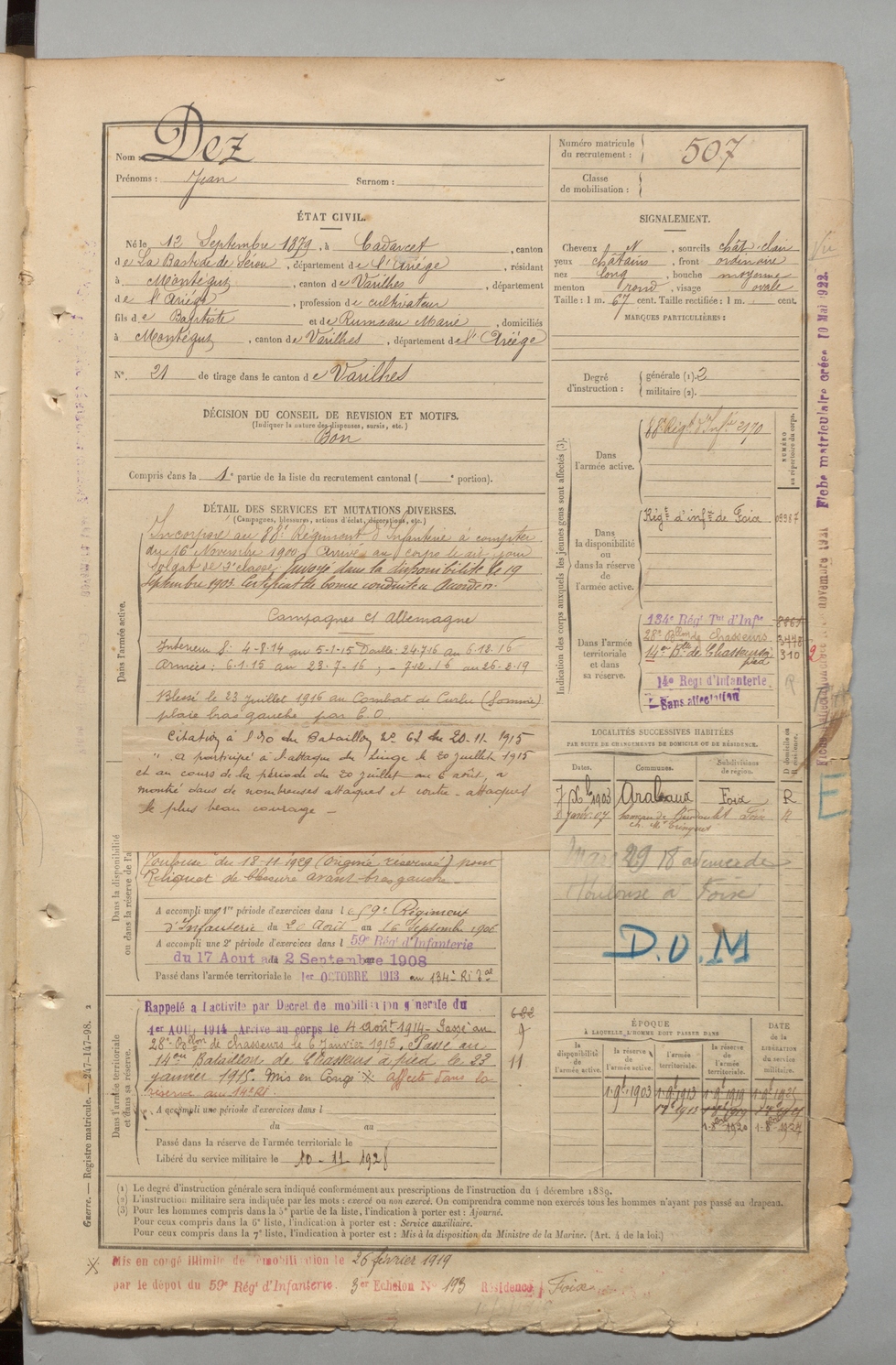 | Dez | Jean | FOIX | 1 R 457 | 1899 | Cadarcet | Montegut | 507 |