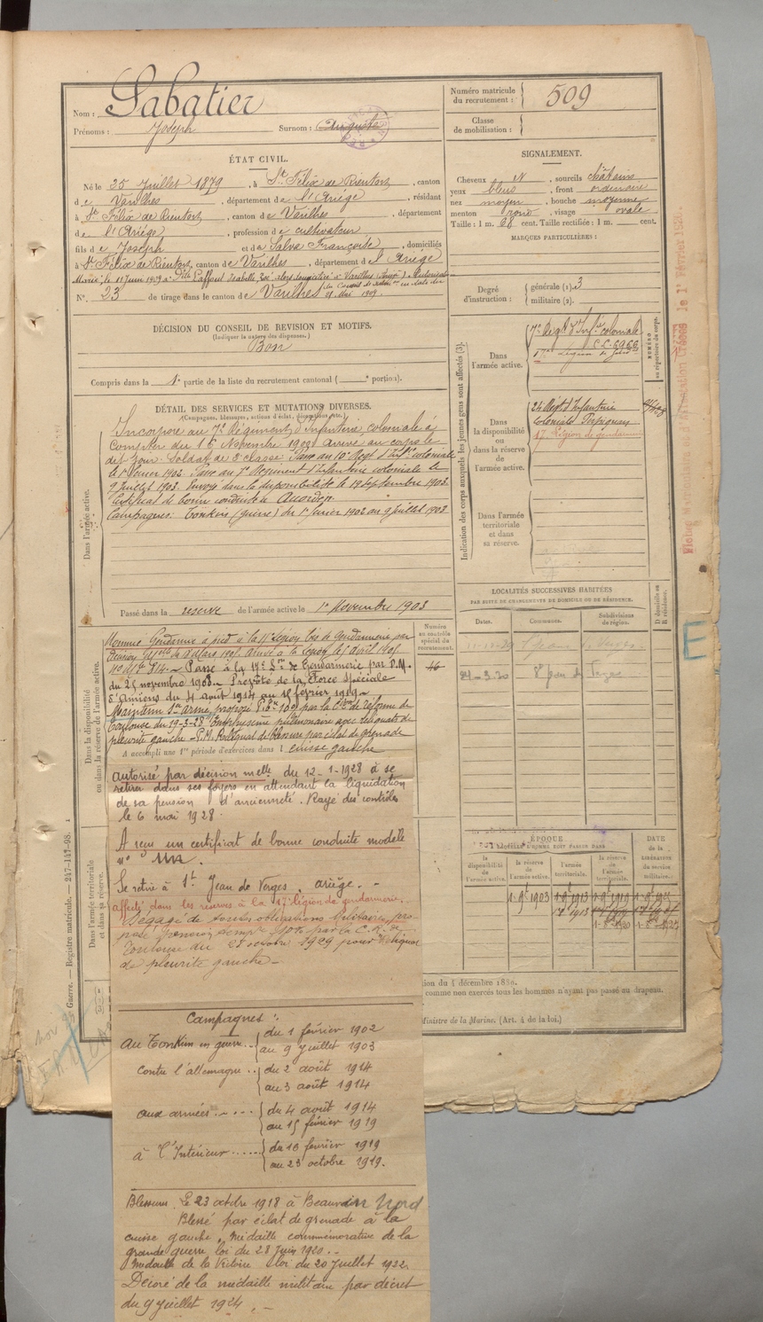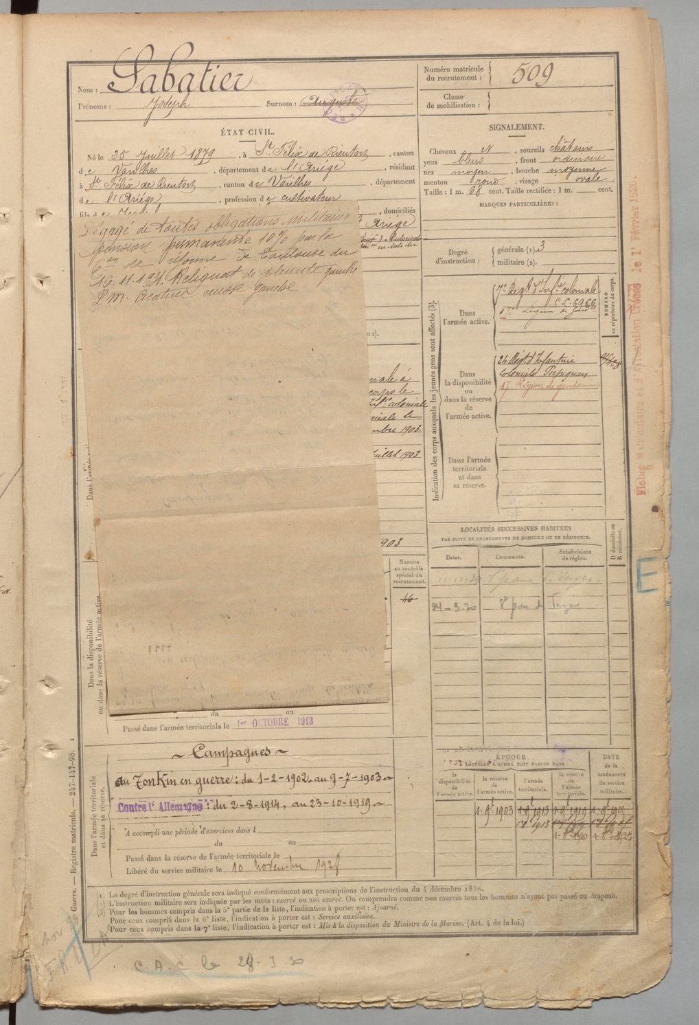 | Sabatier | Joseph dit Auguste | FOIX | 1 R 457 | 1899 | Saint-Félix-de-Rieutort | Saint-Félix-de-Rieutort | 509 |