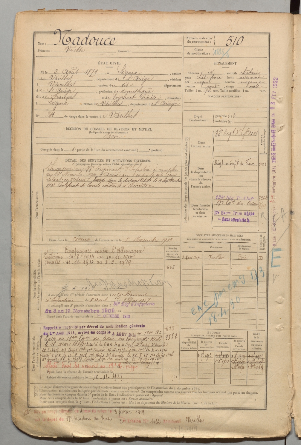 | Nadouce | Victor | FOIX | 1 R 457 | 1899 | Ségura | Varilhes | 510 |