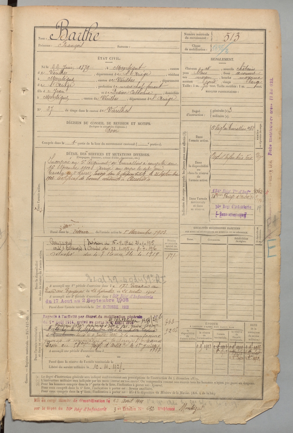 | Barthe | François | FOIX | 1 R 457 | 1899 | Montégut-Plantaurel | Montégut-Plantaurel | 513 |