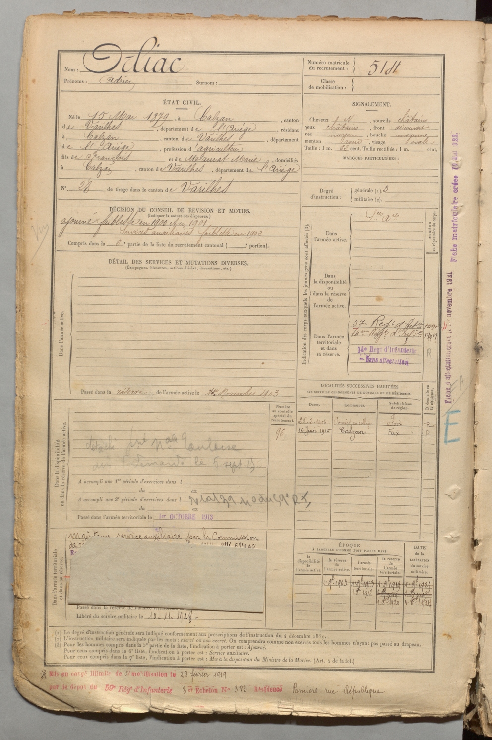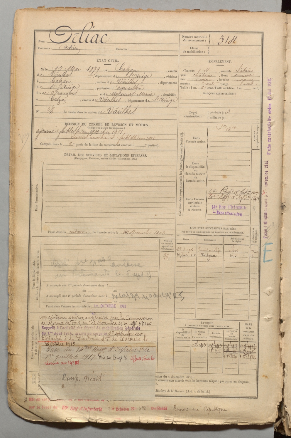 | Orliac | Adrien | FOIX | 1 R 457 | 1899 | Calzan | Calzan | 514 |