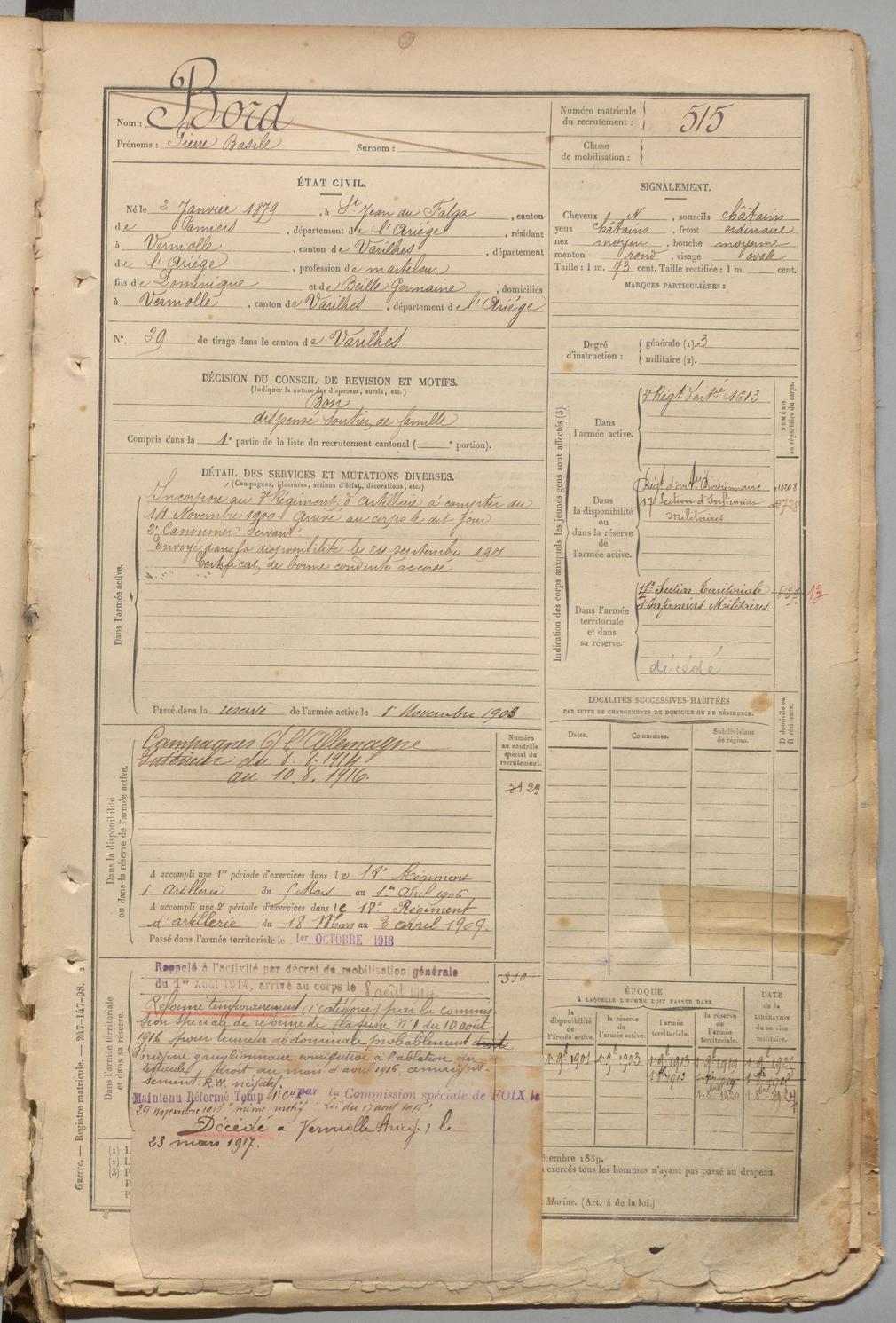 | Bord | Pierre Basile | FOIX | 1 R 457 | 1899 | Saint-Jean-du-Falga | Verniolle | 515 |