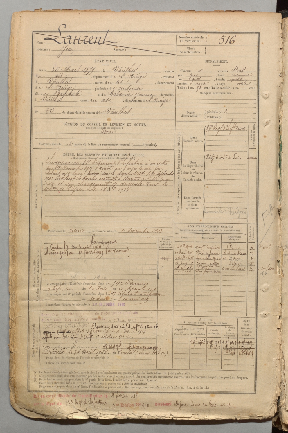 | Laurent | Jean | FOIX | 1 R 457 | 1899 | Varilhes | Varilhes | 516 |
