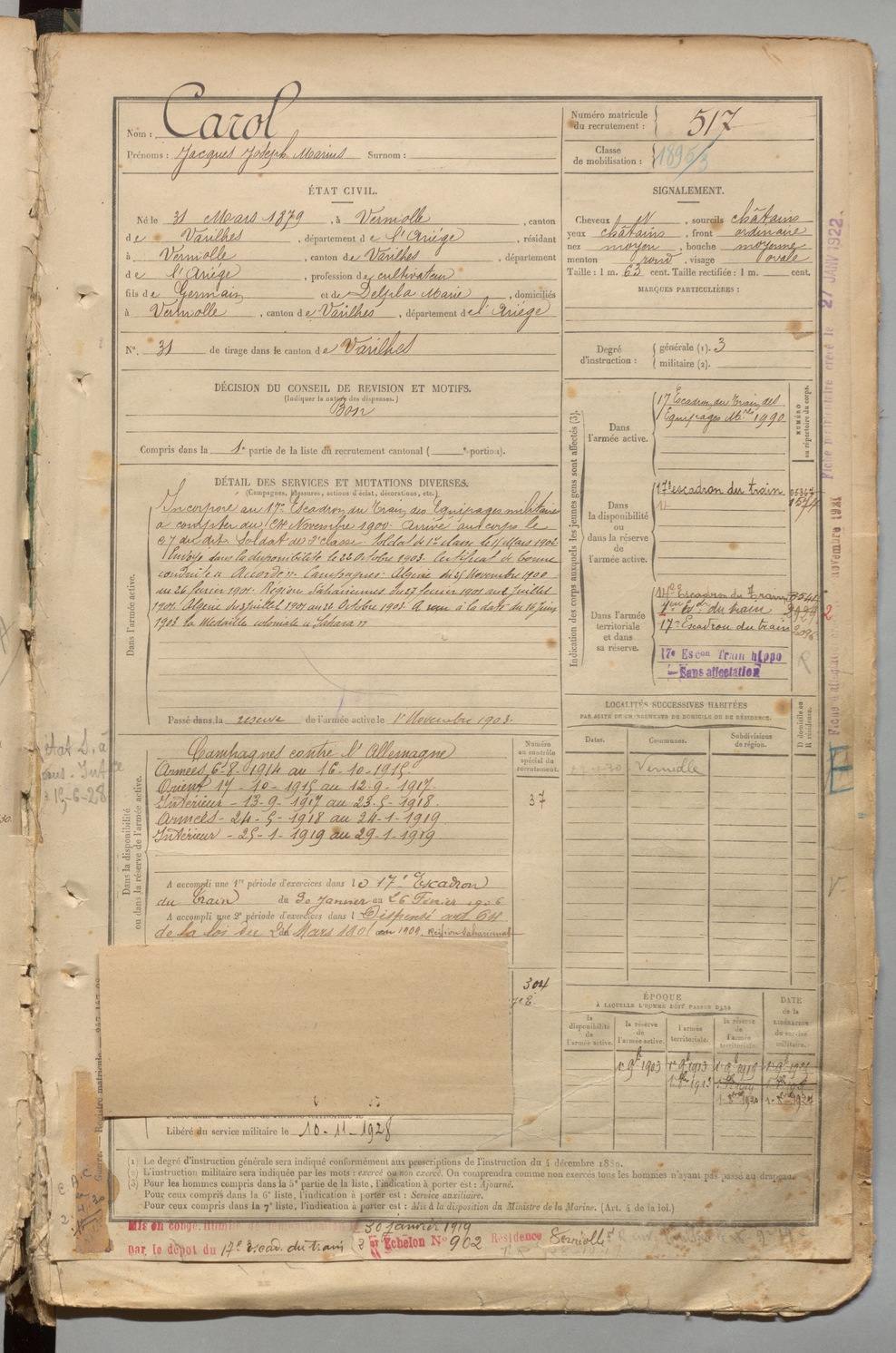 | Carol | Jacques Joseph Marius | FOIX | 1 R 457 | 1899 | Verniolle | Verniolle | 517 |