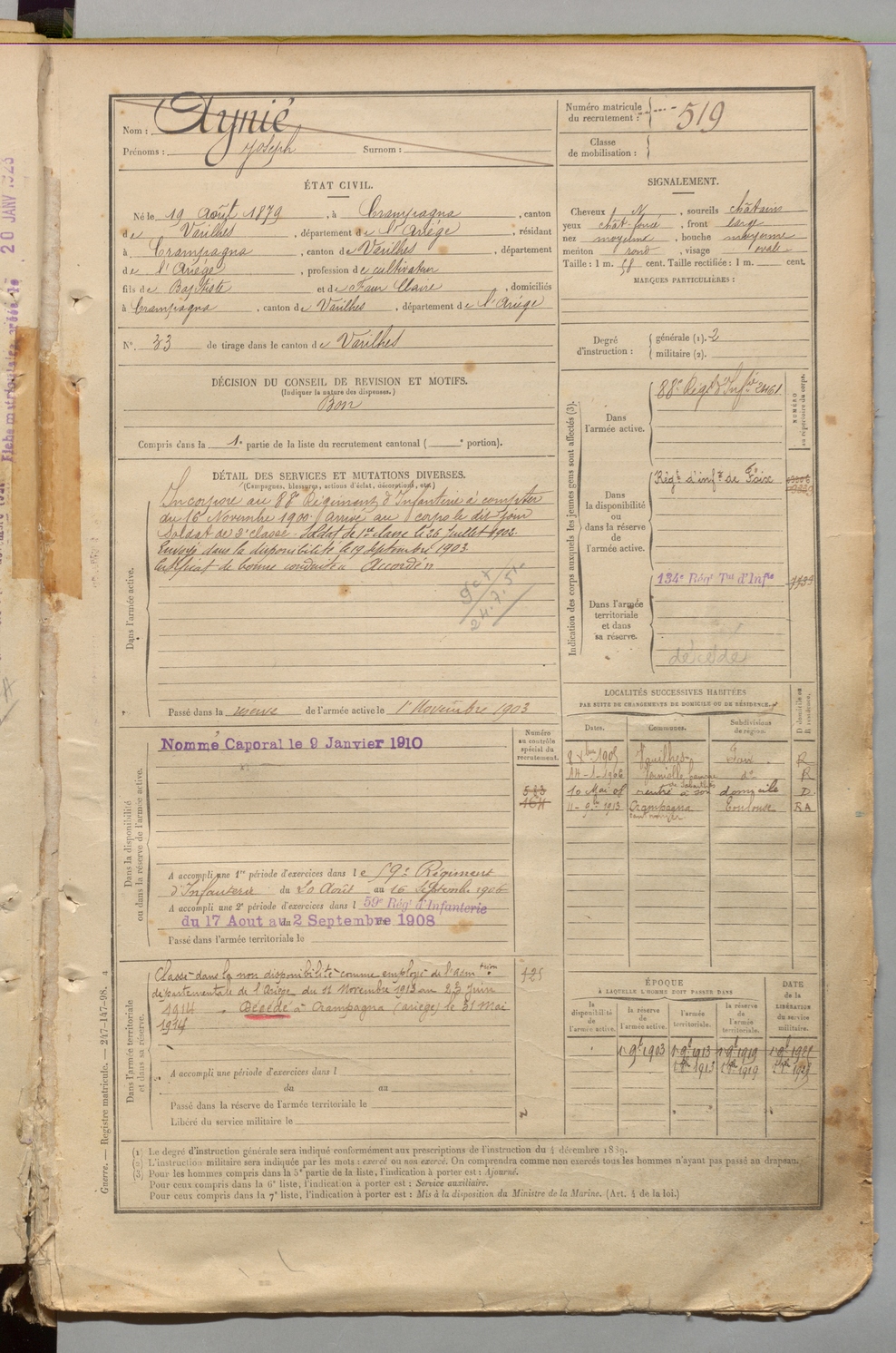 | Aynié | Joseph | FOIX | 1 R 457 | 1899 | Crampagna | Crampagna | 519 |