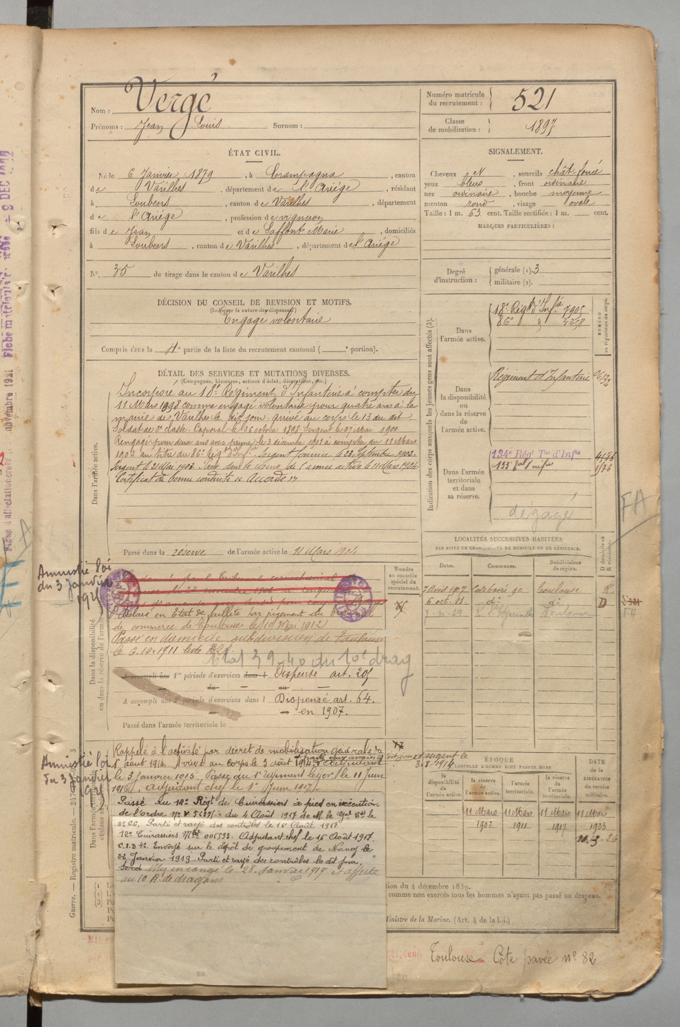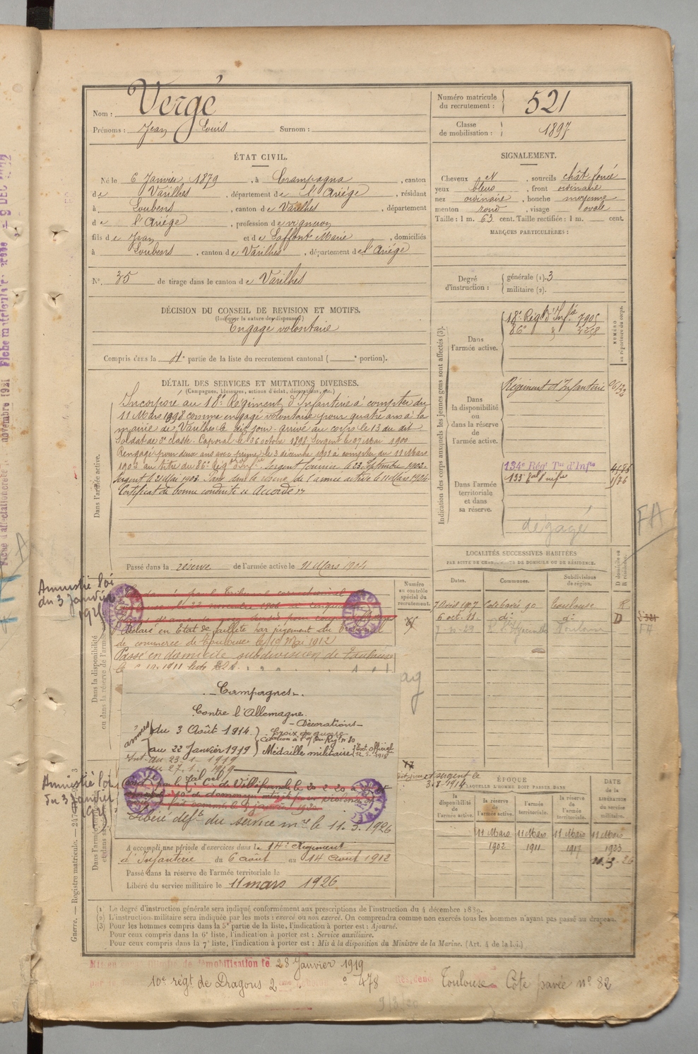 | Vergé | Jean Louis | FOIX | 1 R 457 | 1899 | Crampagna | Loubens | 521 |