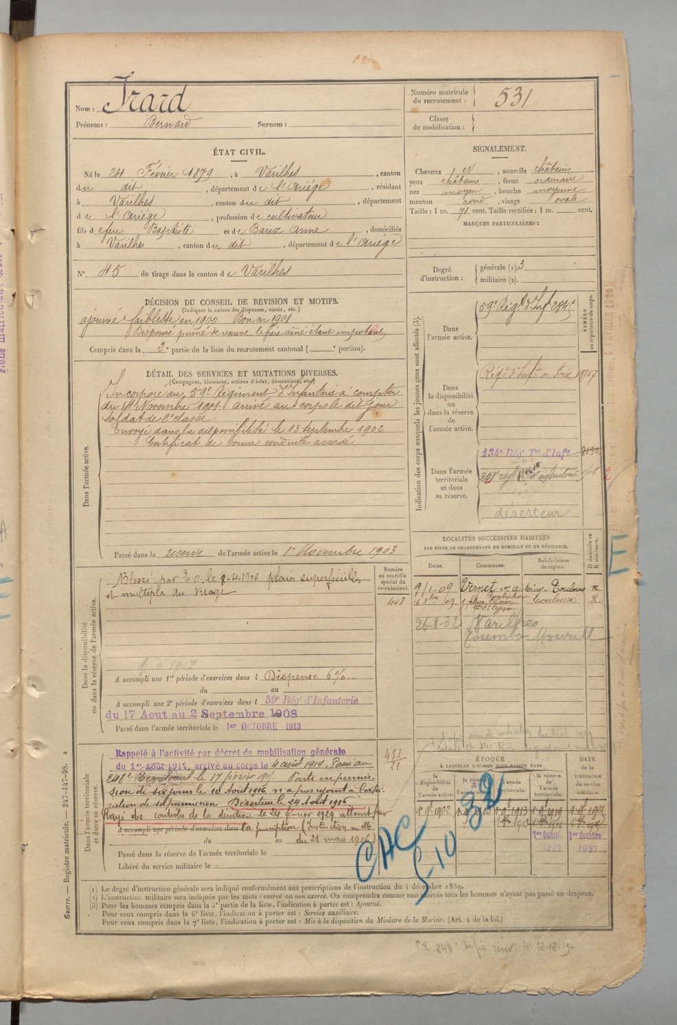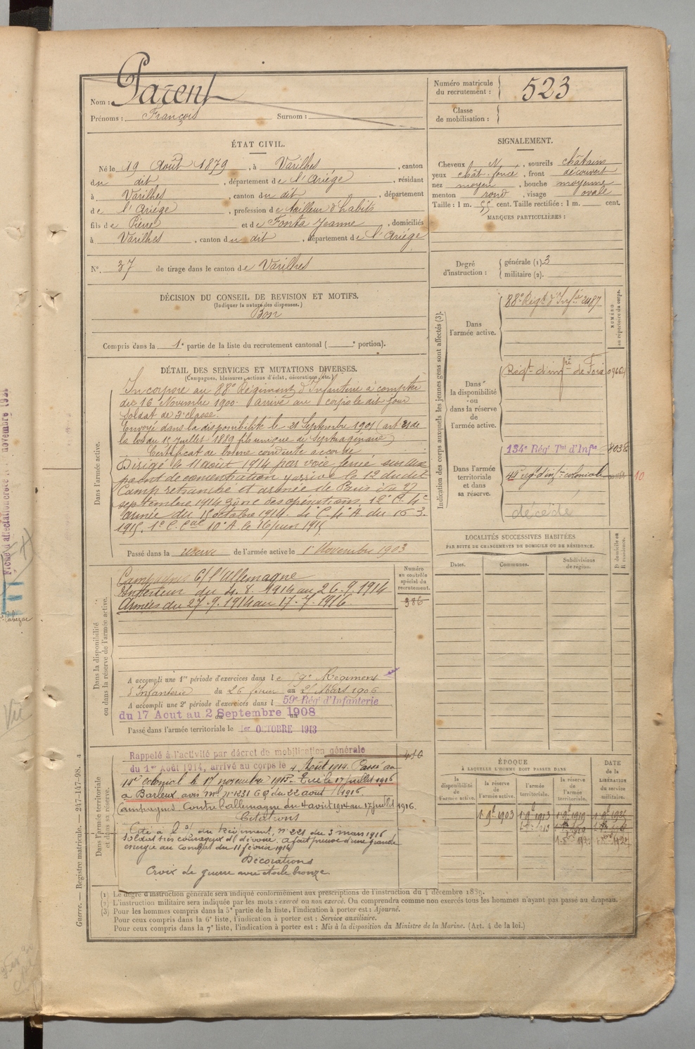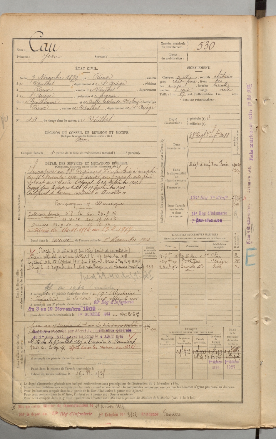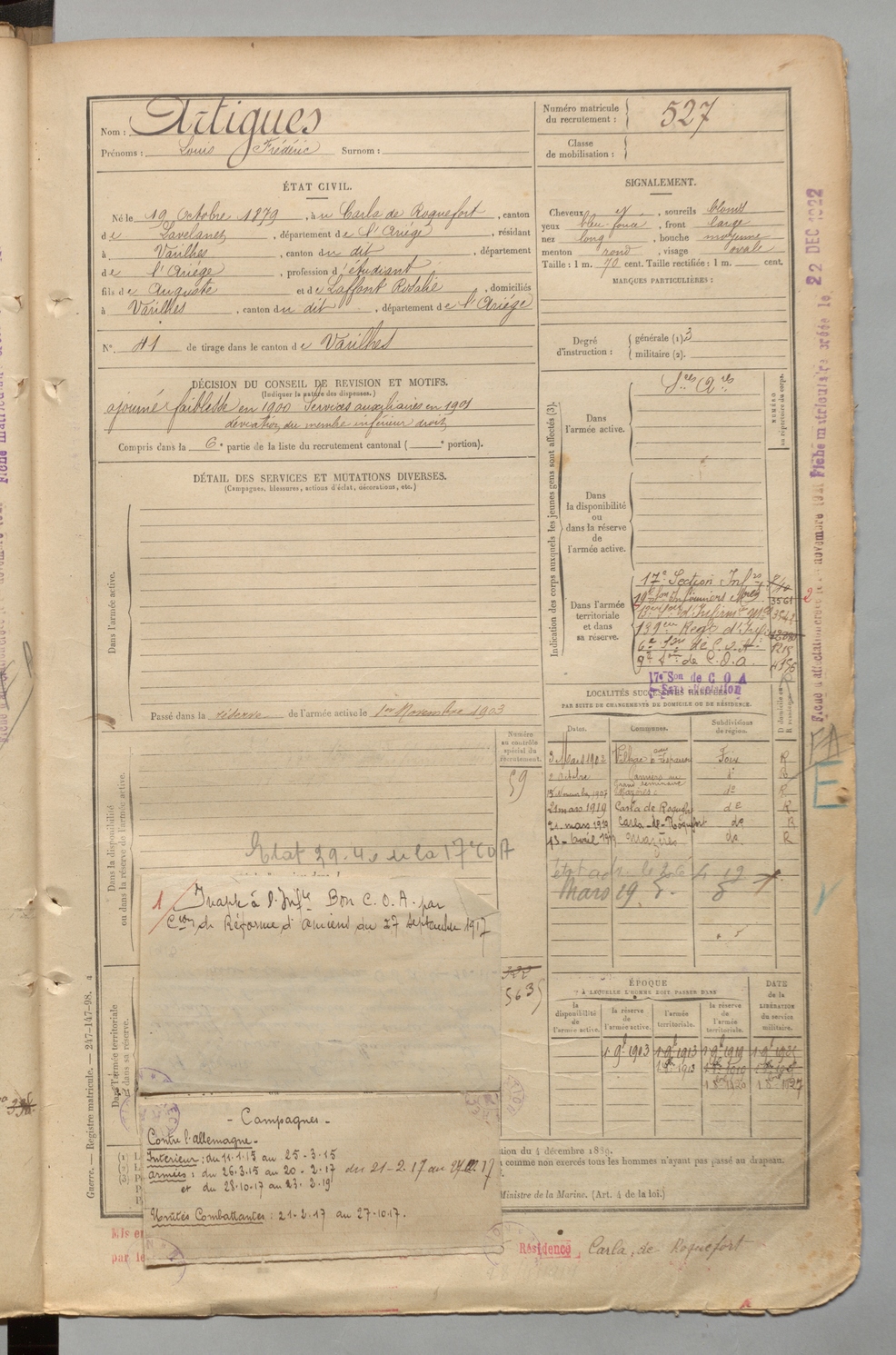 | Artigues | Louis Frédéric | FOIX | 1 R 457 | 1899 | Carla-de-Roquefort (Le) | Varilhes | 527 |