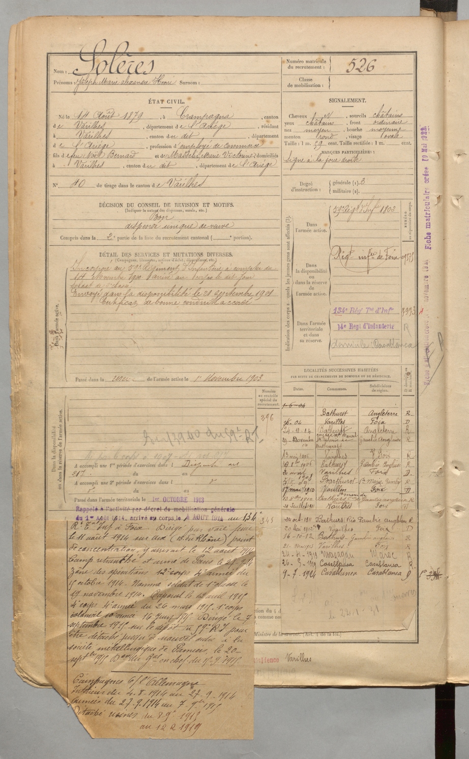| Solères | Joseph Marie Alexandre Henri | FOIX | 1 R 457 | 1899 | Crampagna | Varilhes | 526 |