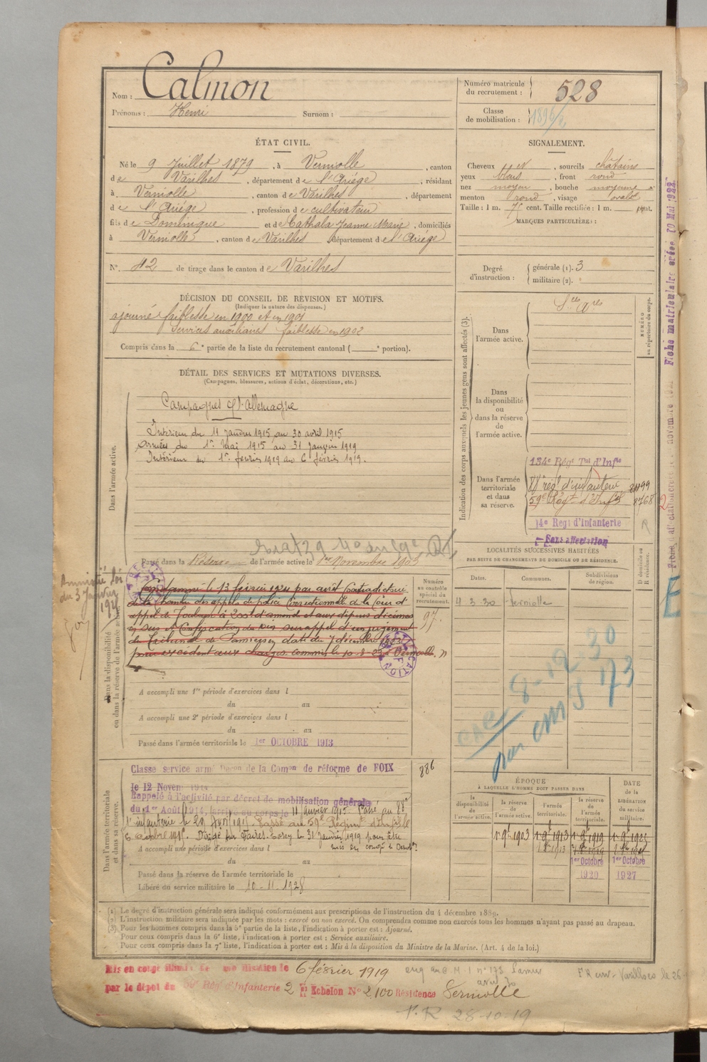 | Calmon | Henri | FOIX | 1 R 457 | 1899 | Verniolle | Verniolle | 528 |