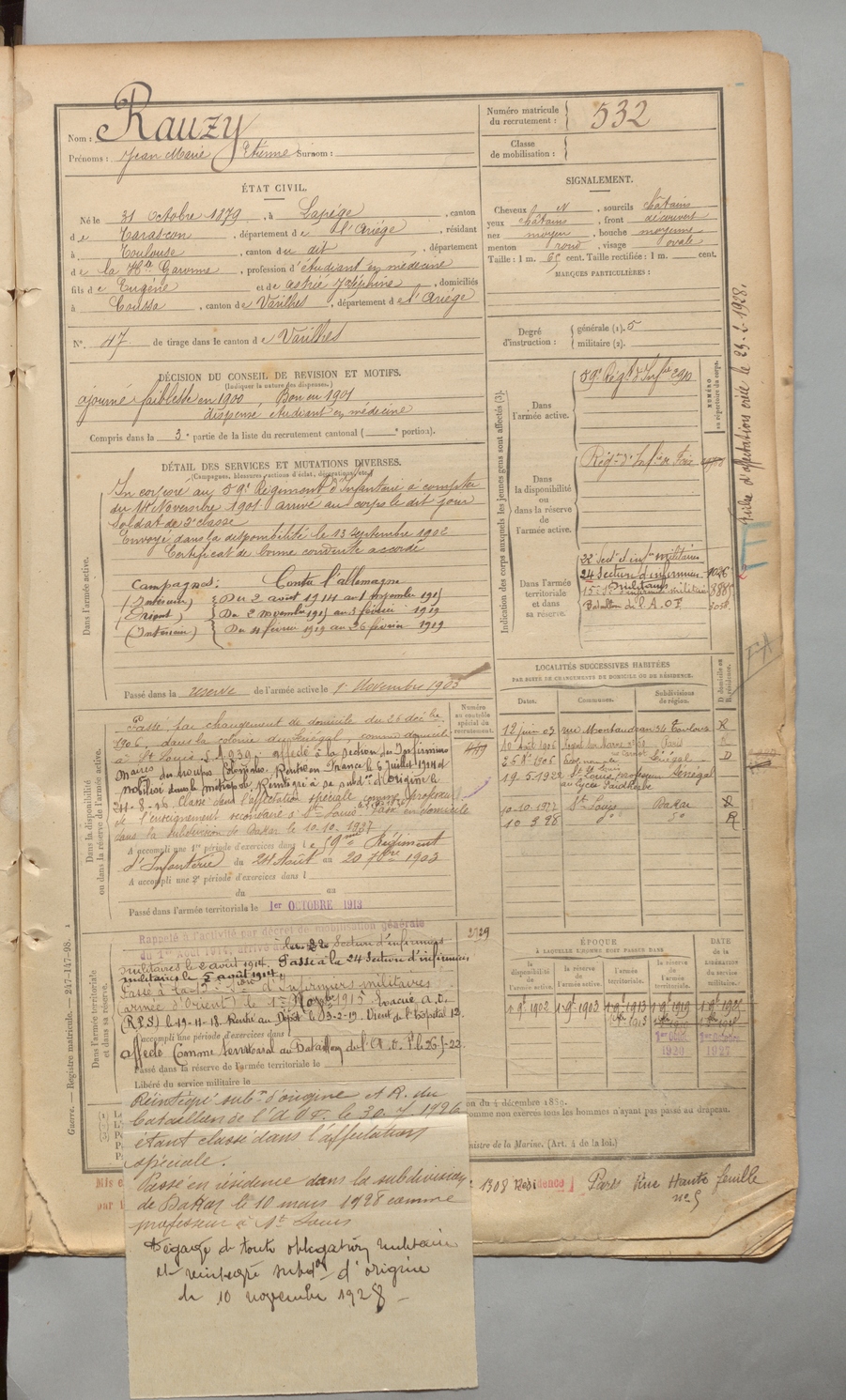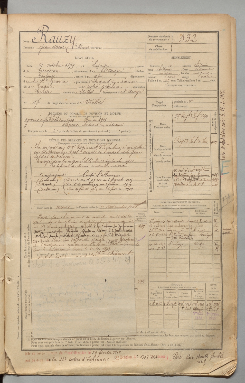 | Rauzy | Jean Marie Etienne | FOIX | 1 R 457 | 1899 | Lapège | Toulouse | 532 |