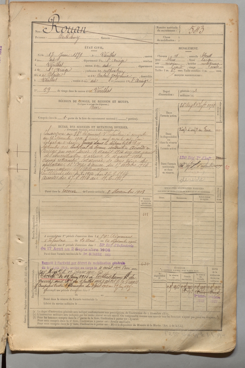 | Rouan | Barthélemy | FOIX | 1 R 457 | 1899 | Varilhes | Varilhes | 543 |