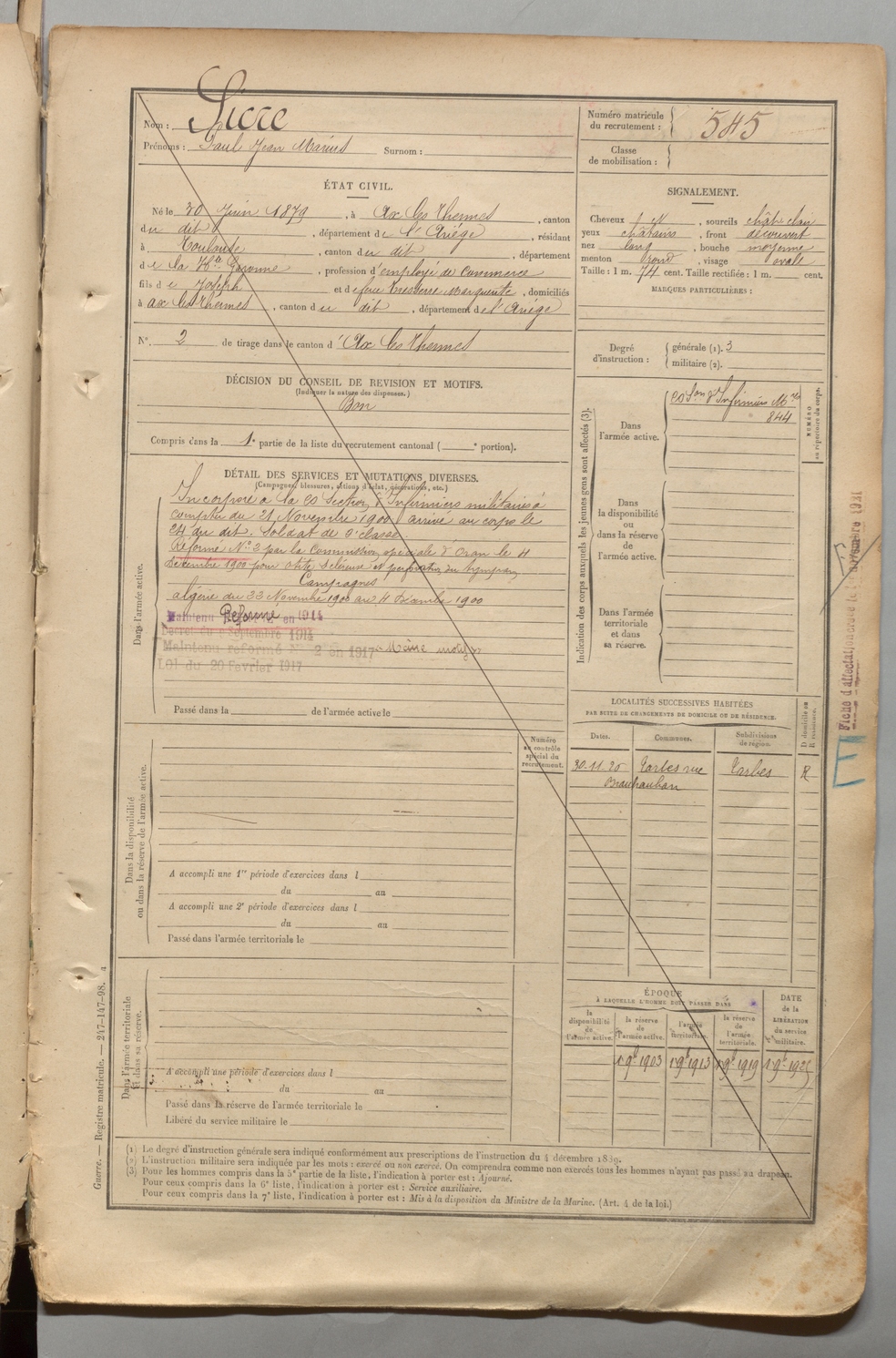 | Sicre | Paul Jean Marius | FOIX | 1 R 457 | 1899 | Ax-les-Thermes | Toulouse | 545 |