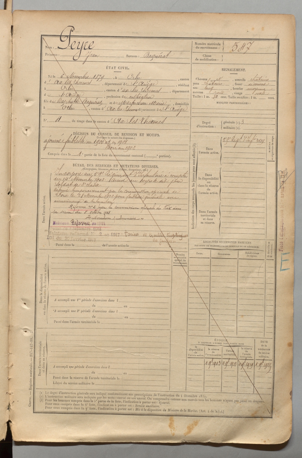 | Peyre | Jean dit Baquérat | FOIX | 1 R 457 | 1899 | Orlu | Orlu | 547 |