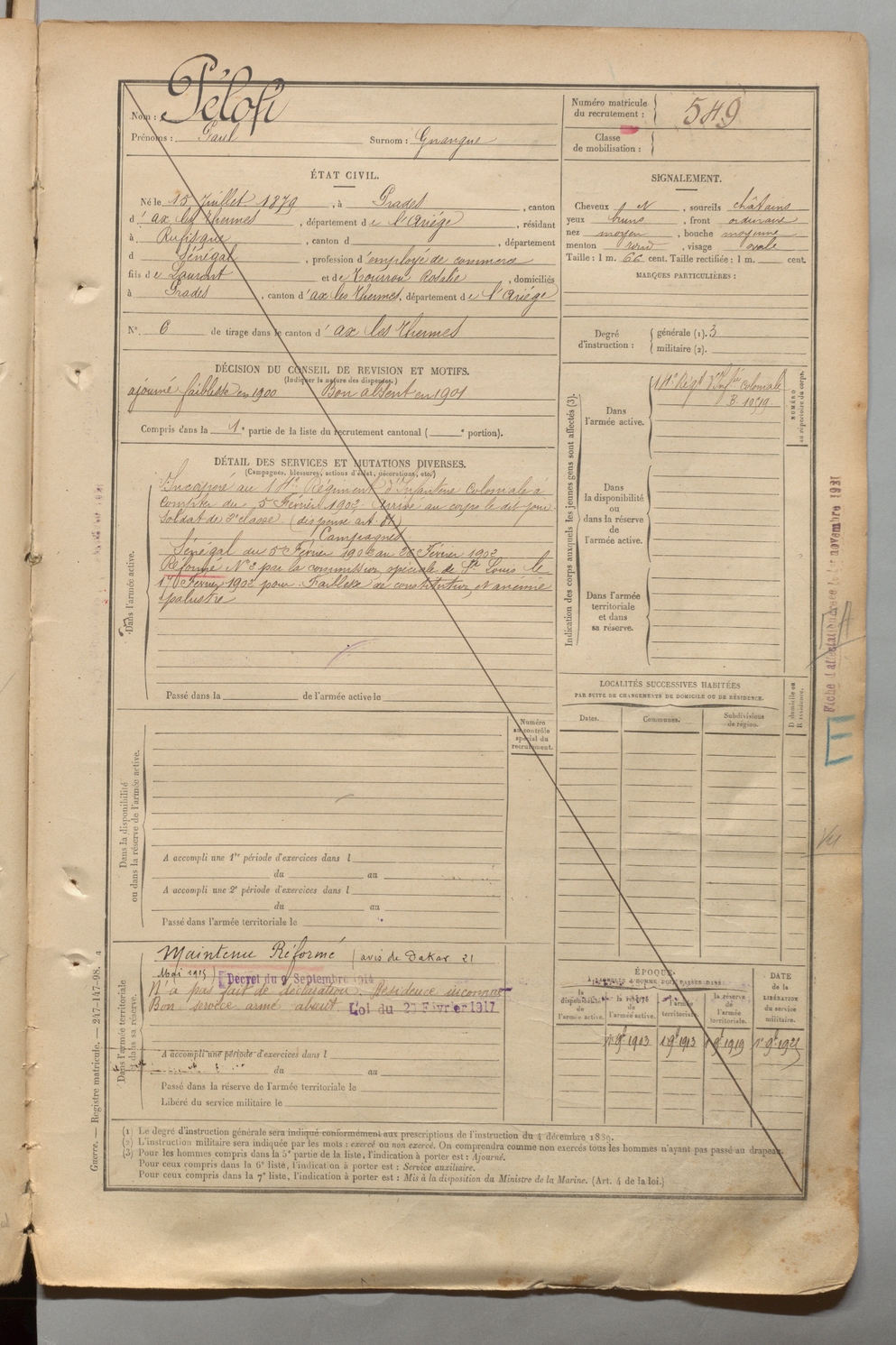 | Pélofi | Paul dit Gnangue | FOIX | 1 R 457 | 1899 | Prades | Rufisque | 549 |