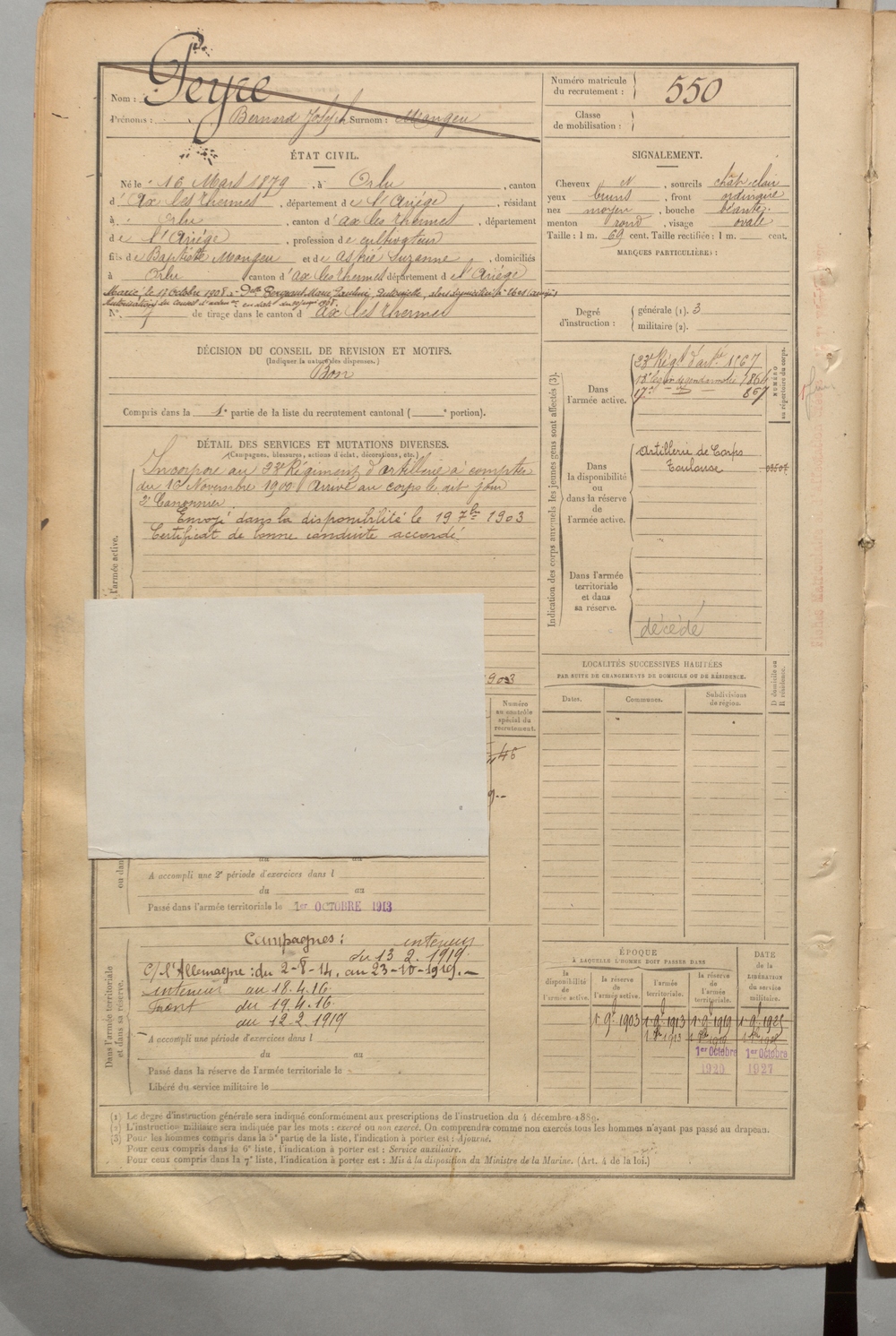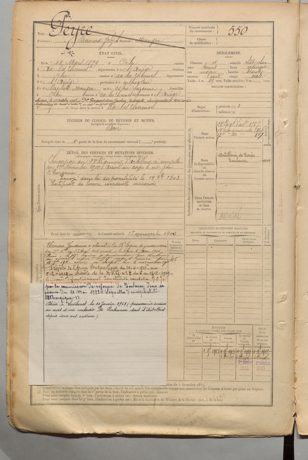 | Peyre | Bernard Joseph dit Mangeu | FOIX | 1 R 457 | 1899 | Orlu | Orlu | 550 |