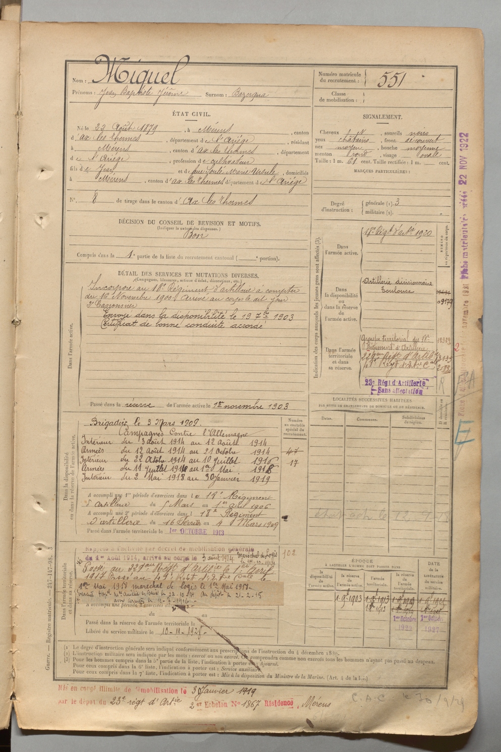 | Miquel | Jean Baptiste Jérôme dit Bazerqua | FOIX | 1 R 457 | 1899 | Mérens-les-Vals | Mérens-les-Vals | 551 |