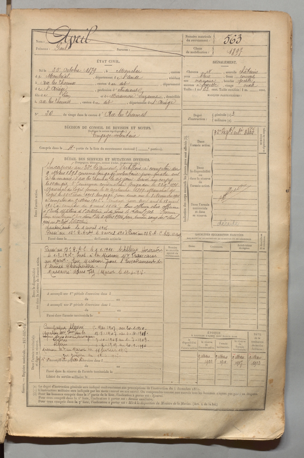 | Avril | Paul | FOIX | 1 R 457 | 1899 | Monclar | Ax-les-Thermes | 563 |