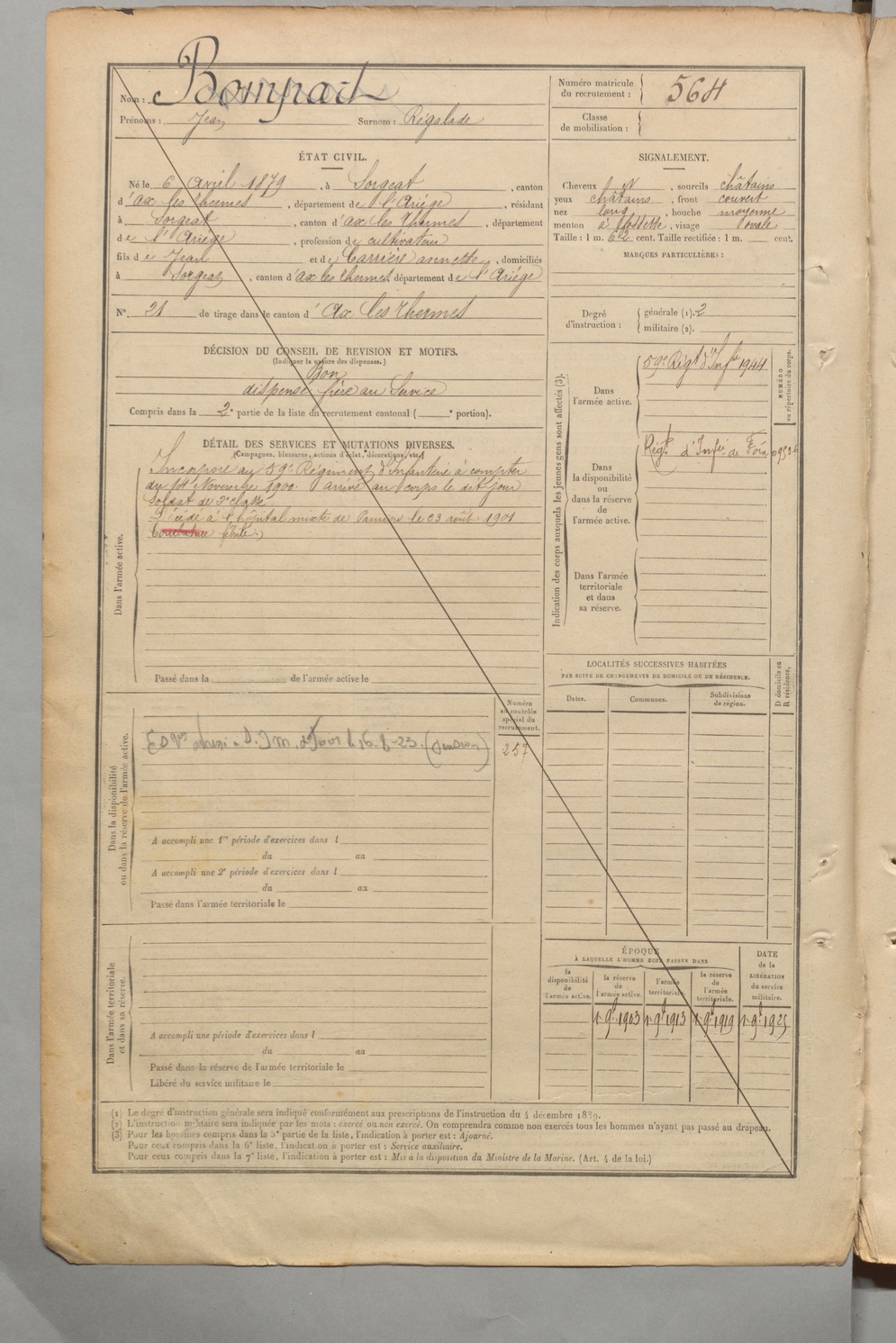 | Bompart | Jean dit Régalade | FOIX | 1 R 457 | 1899 | Sorgeat | Sorgeat | 564 |