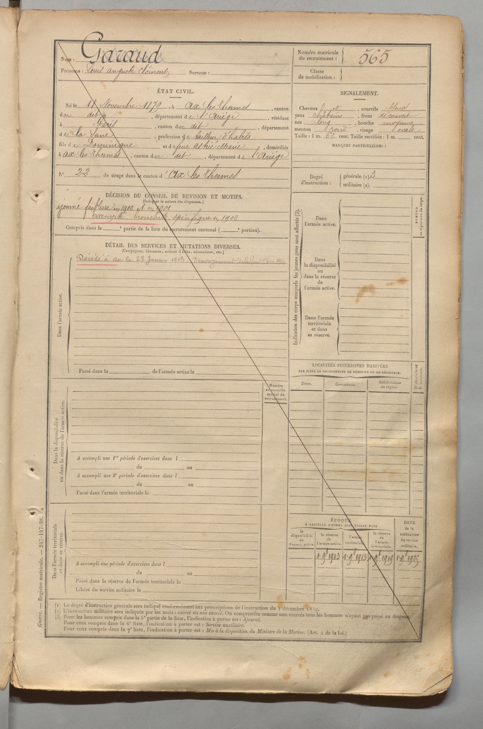 | Garaud | Louis Auguste Clément | FOIX | 1 R 457 | 1899 | Ax-les-Thermes | Paris | 565 |