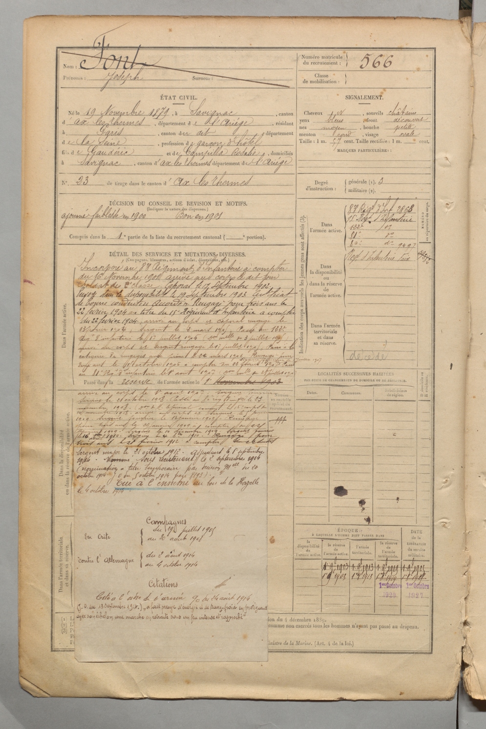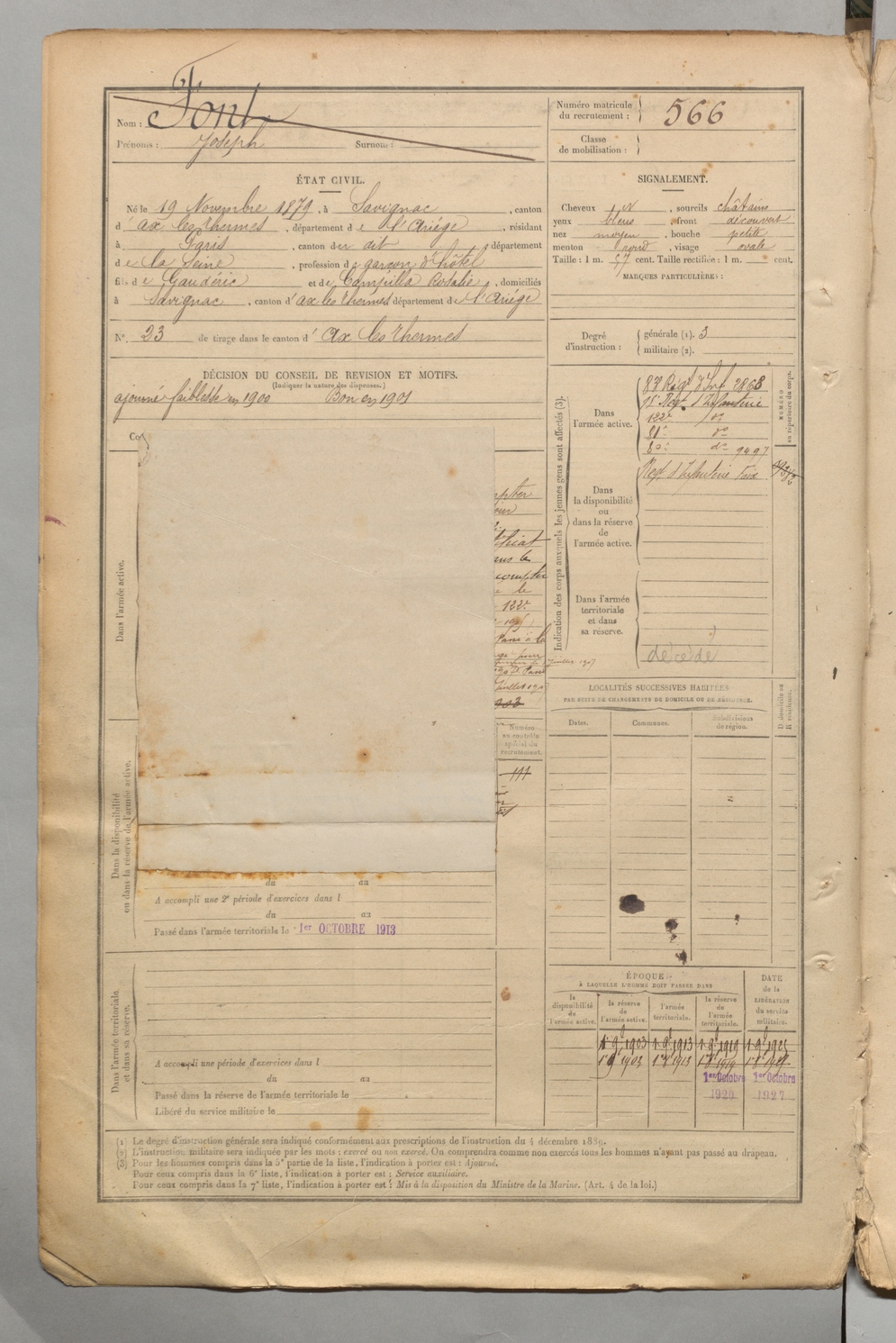 | Font | Joseph | FOIX | 1 R 457 | 1899 | Savignac-les-Ormeaux | Paris | 566 |