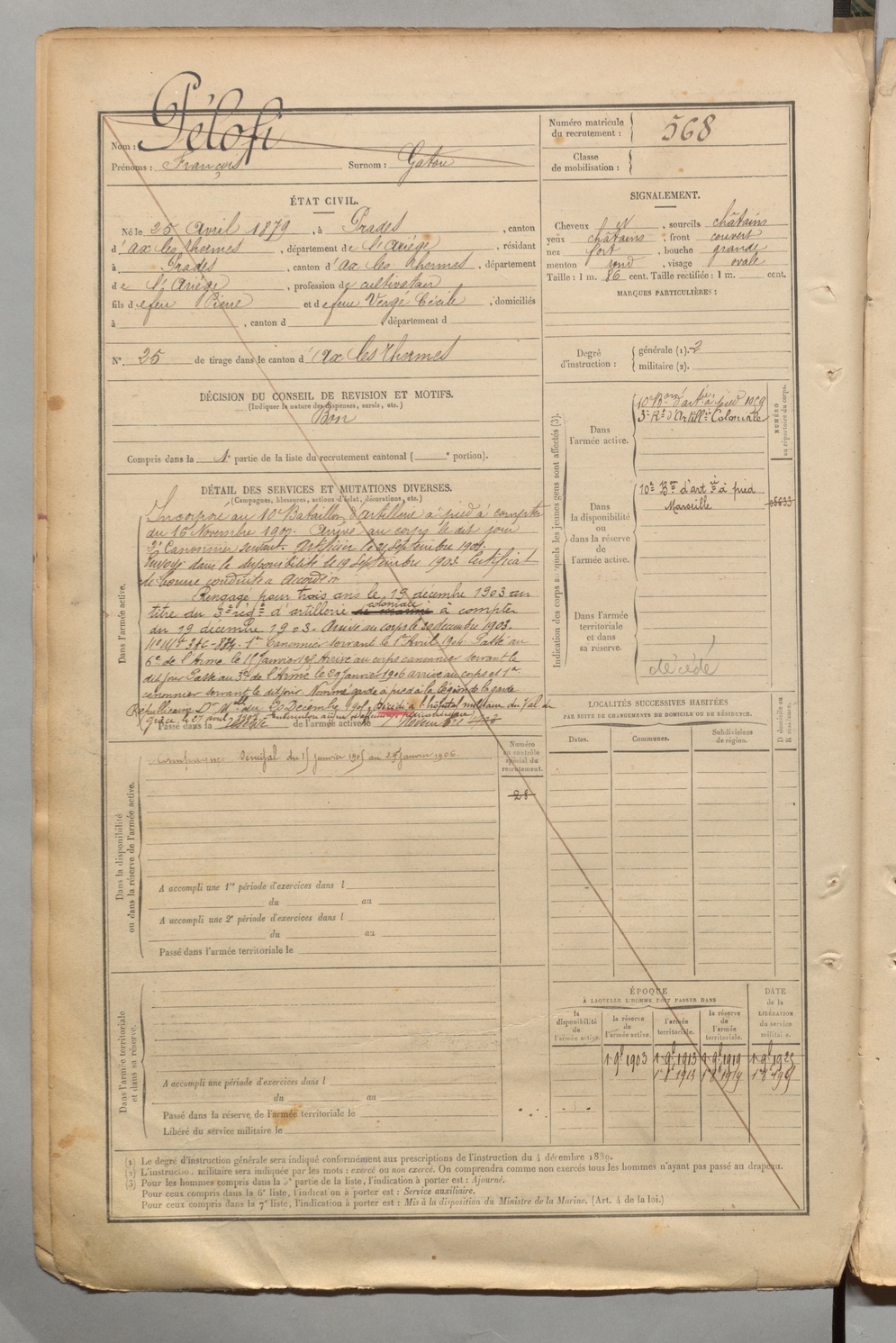 | Pélofi | François dit Gatou | FOIX | 1 R 457 | 1899 | Prades | Prades | 568 |