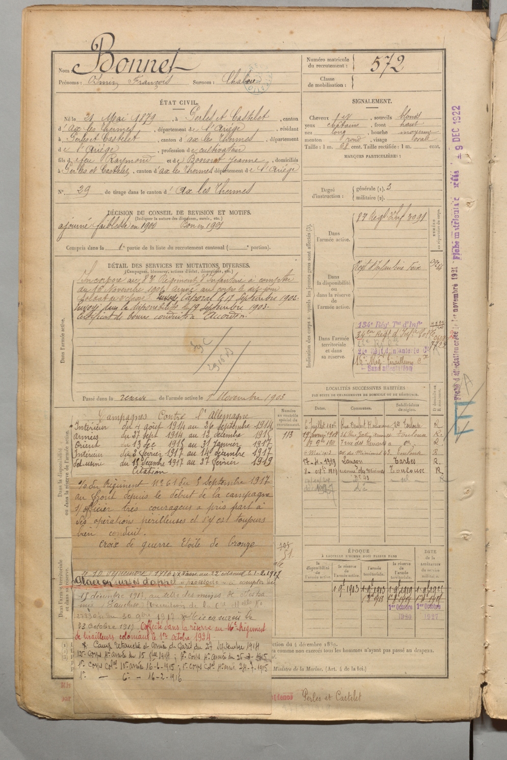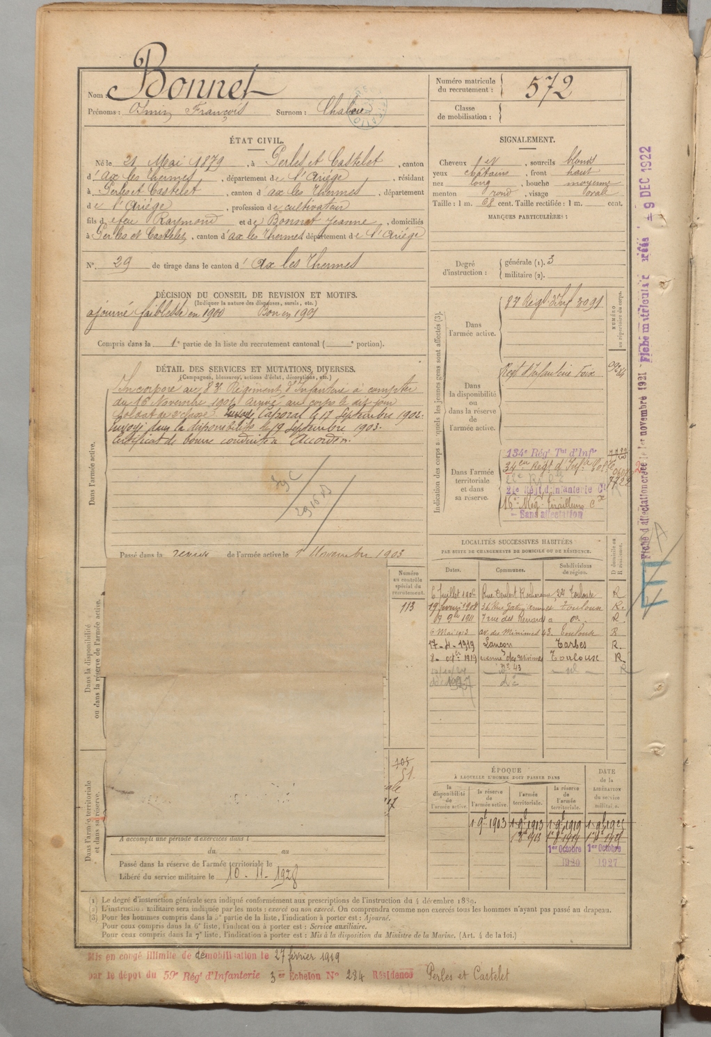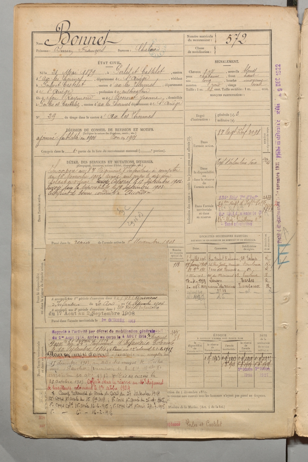 | Bonnet | Osmin François dit Chalou | FOIX | 1 R 457 | 1899 | Perles-et-Castelet | Perles-et-Castelet | 572 |