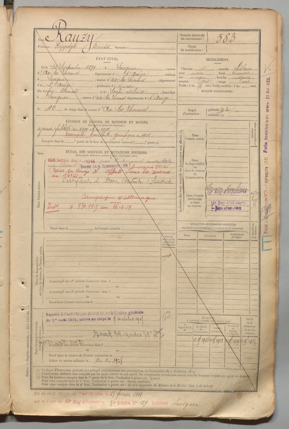 | Rauzy | Hippolyte Bernard | FOIX | 1 R 457 | 1899 | Savignac-les-Ormeaux | Savignac-les-Ormeaux | 583 |