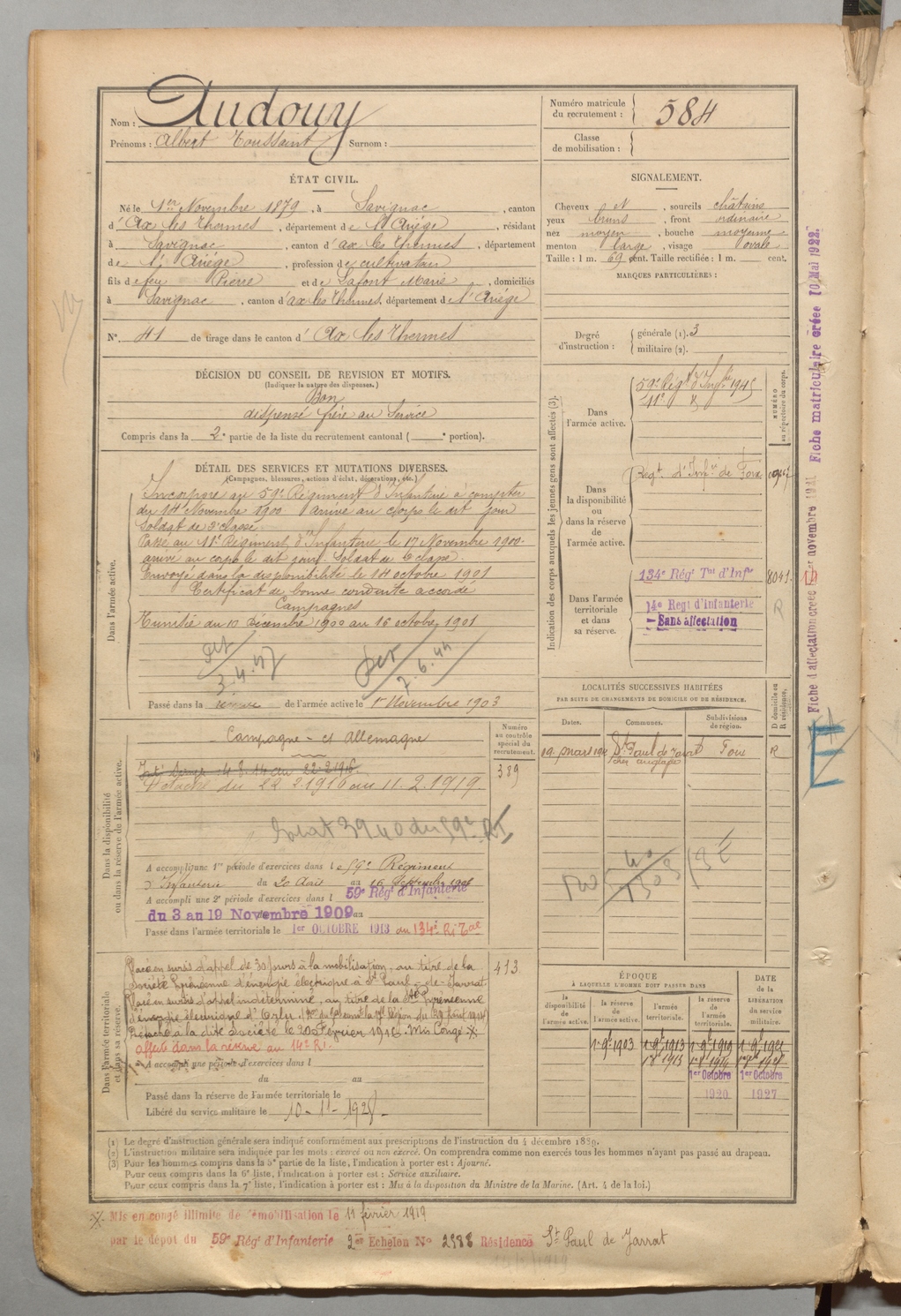 | Audouy | Albert Toussaint | FOIX | 1 R 457 | 1899 | Savignac-les-Ormeaux | Savignac-les-Ormeaux | 584 |