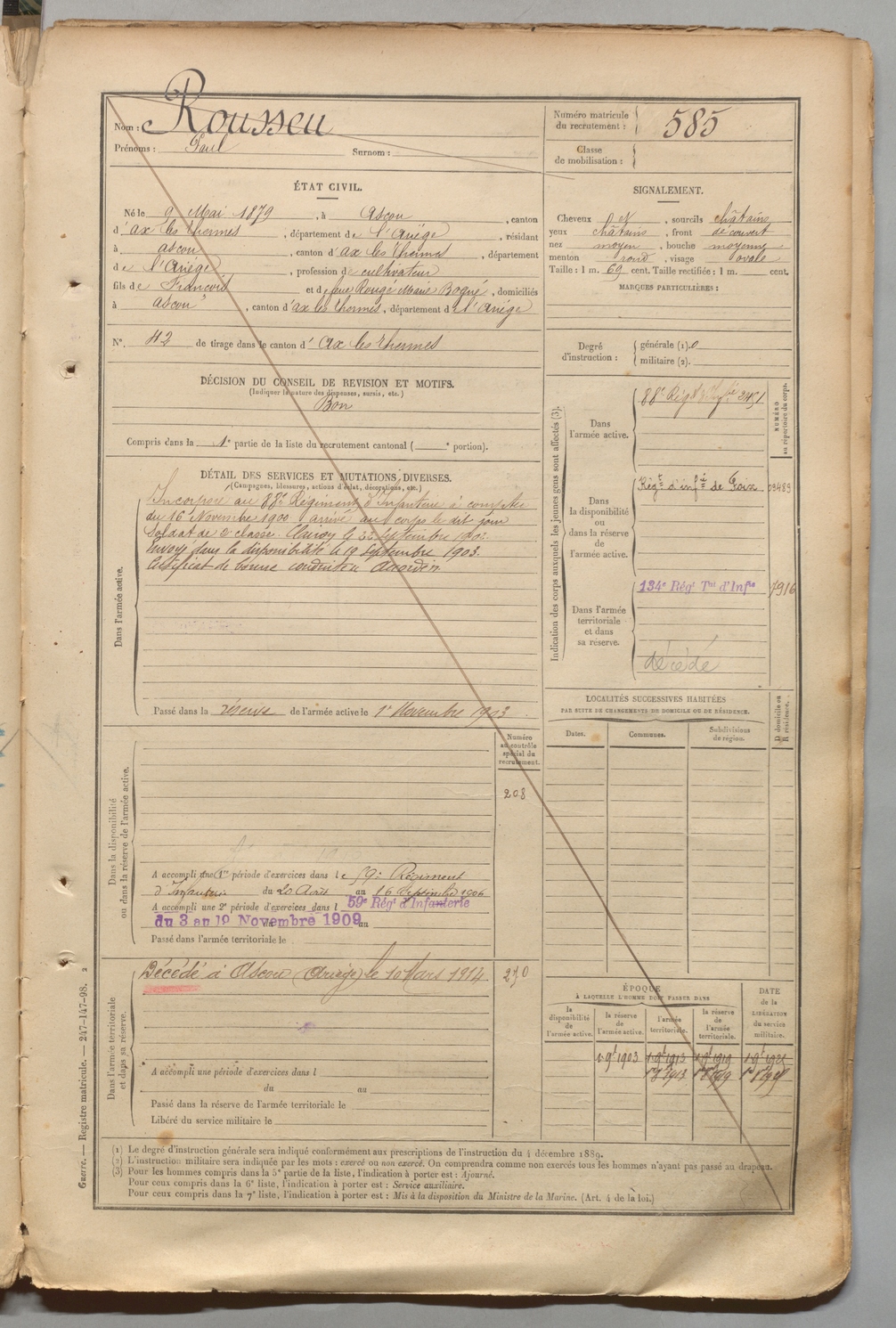 | Rousseu | Paul | FOIX | 1 R 457 | 1899 | Ascou | Ascou | 585 |