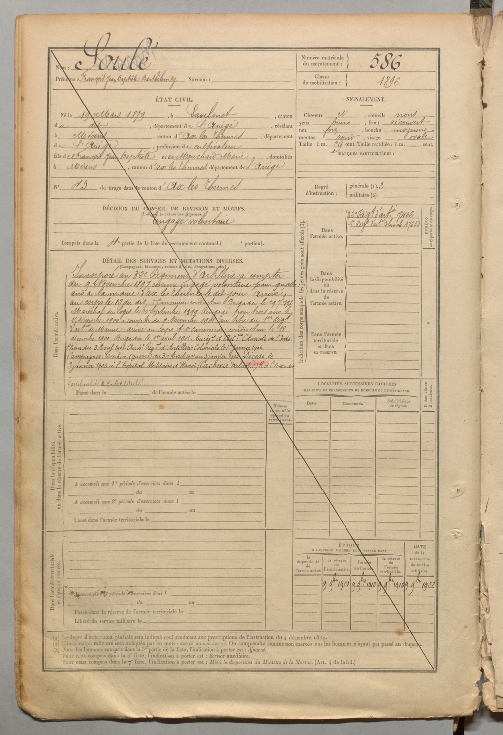 | Soulé | François Jean Baptiste Barthélemy | FOIX | 1 R 457 | 1899 | Lavelanet | Mérens-les-Vals | 586 |