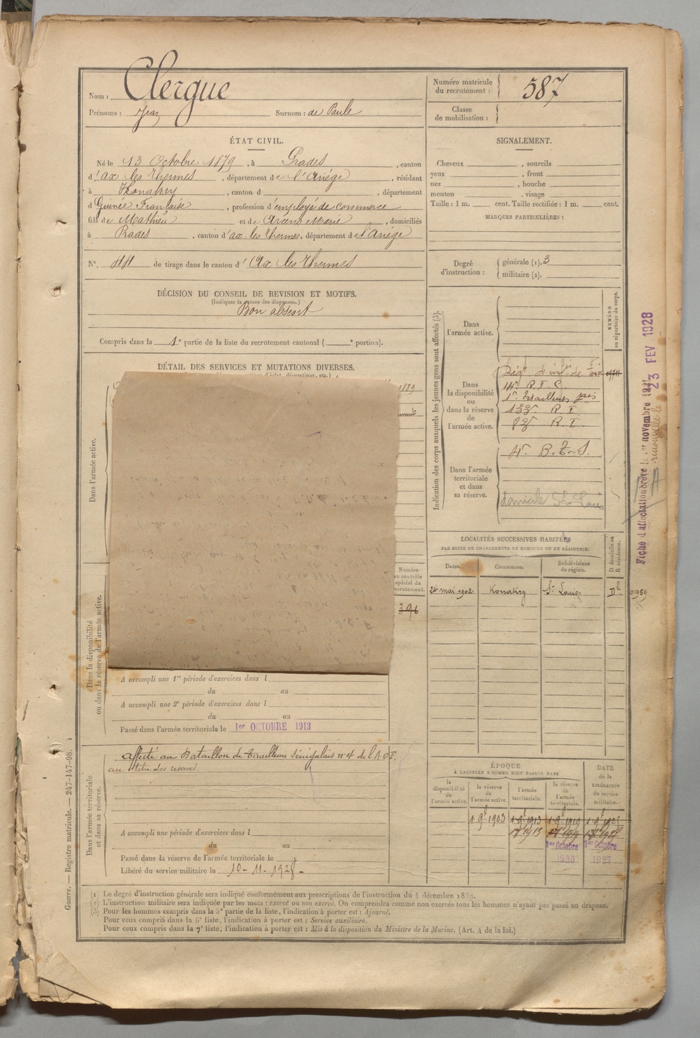 | Clergue | Jean dit De Paule | FOIX | 1 R 457 | 1899 | Prades | Konakry | 587 |