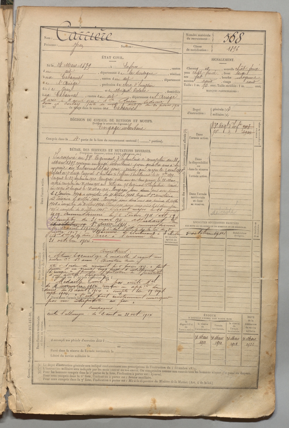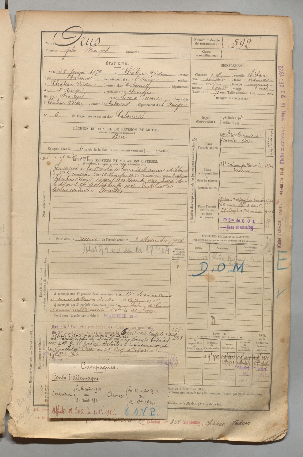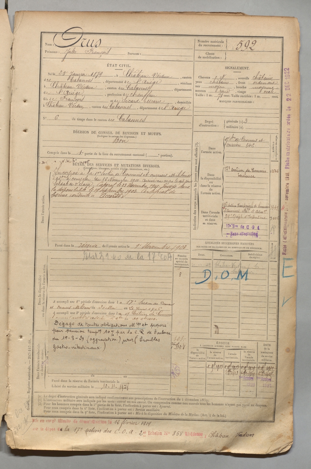 | Orus | Jules François | FOIX | 1 R 457 | 1899 | Château-Verdun | Château-Verdun | 592 |