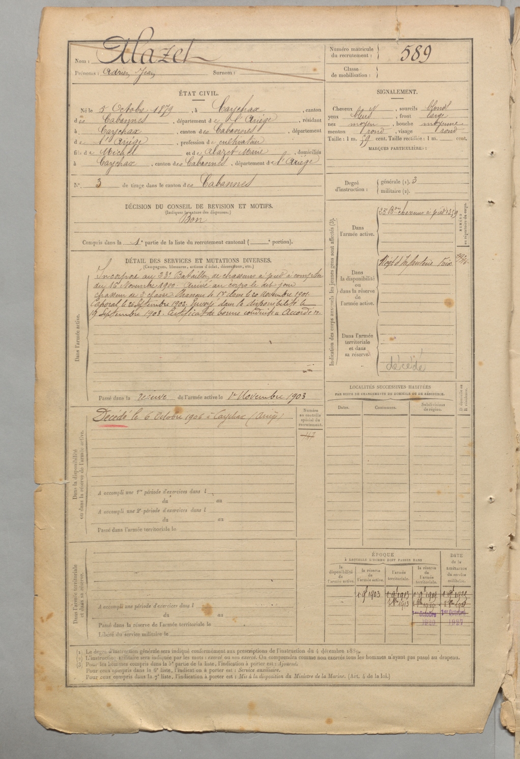 | Alazet | Adrien Jean | FOIX | 1 R 457 | 1899 | Caychax | Caychax | 589 |