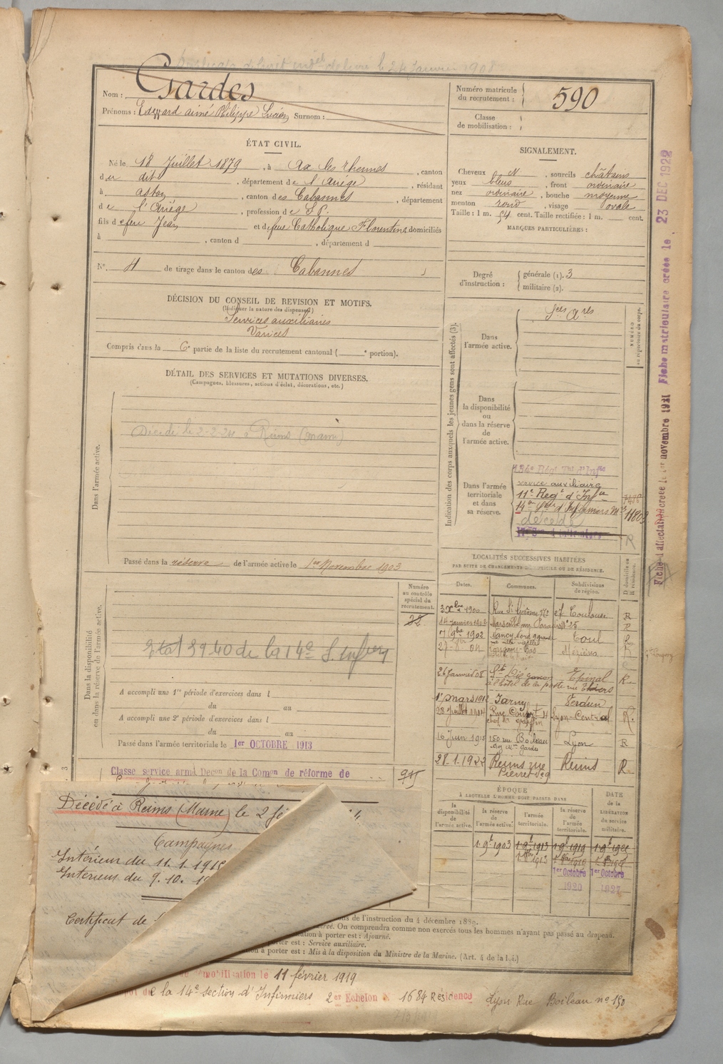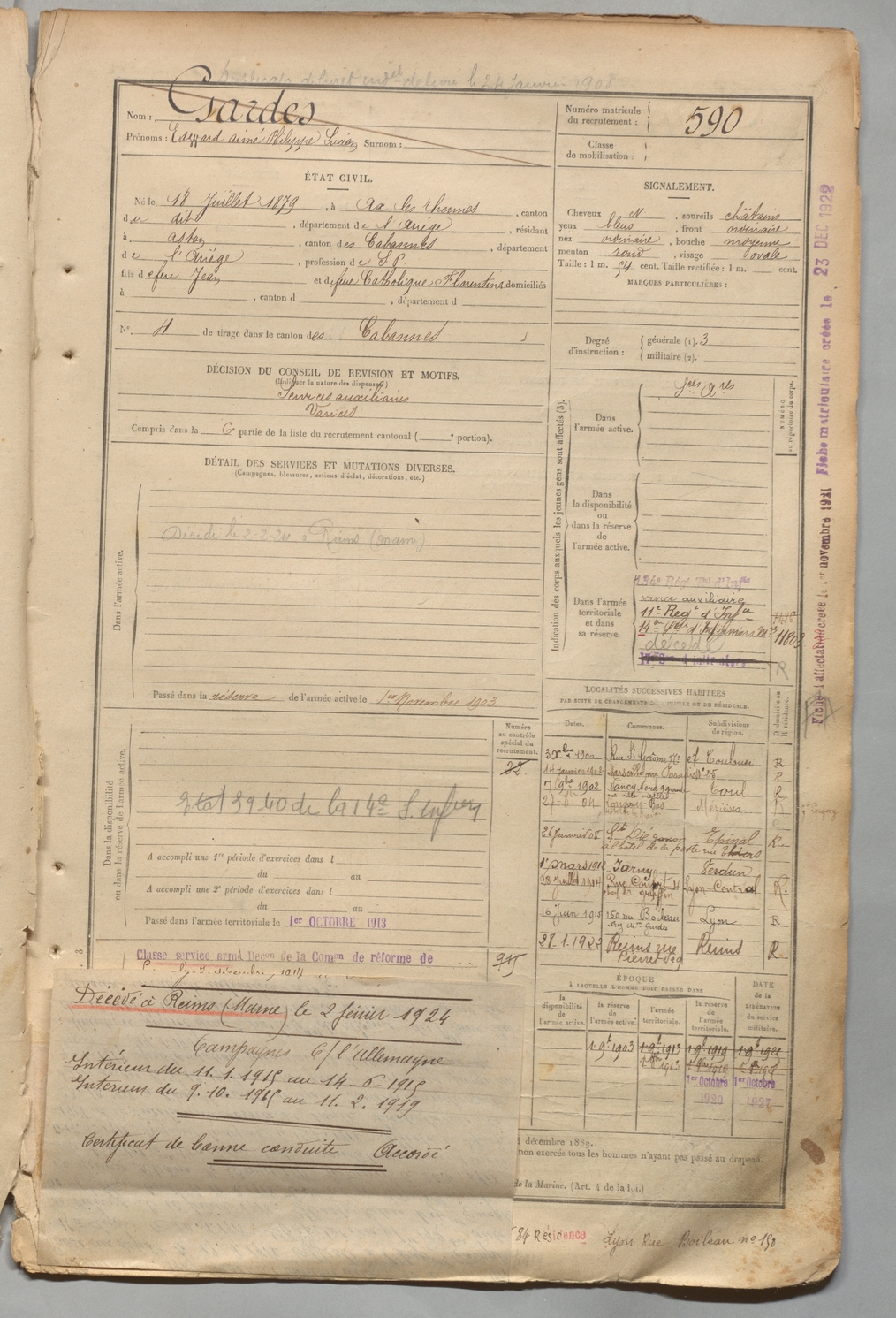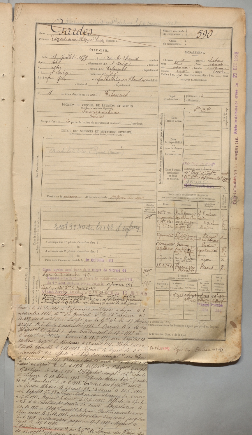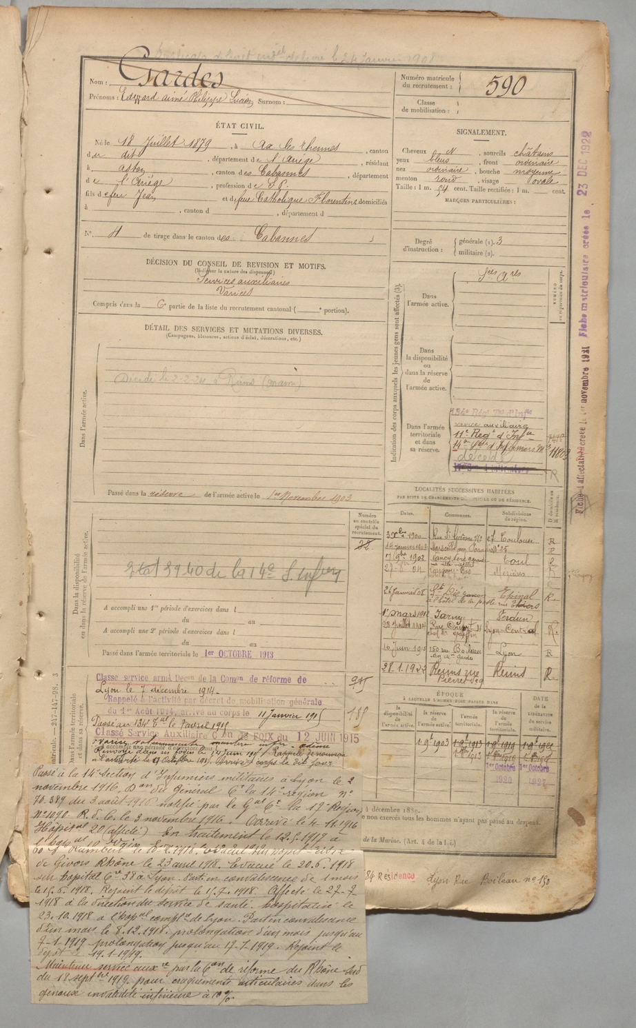 | Gardes | Edward Aimé Philippe Lucien | FOIX | 1 R 457 | 1899 | Ax-les-Thermes | Aston | 590 |