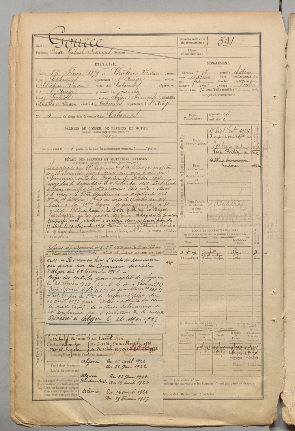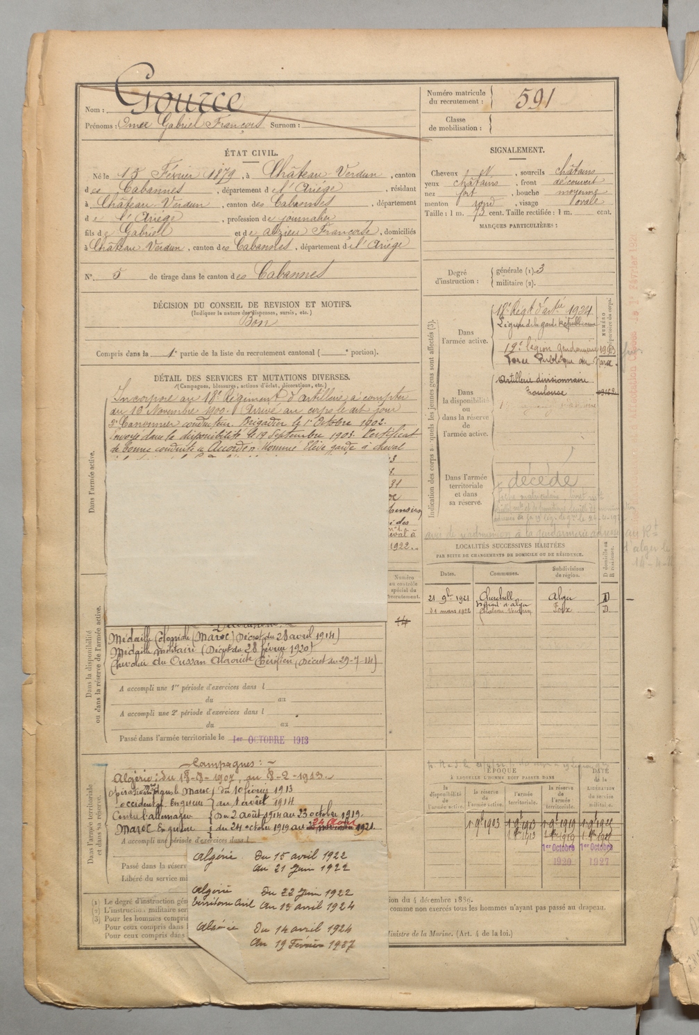 | Gource | Omer Gabriel François | FOIX | 1 R 457 | 1899 | Château-Verdun | Château-Verdun | 591 |
