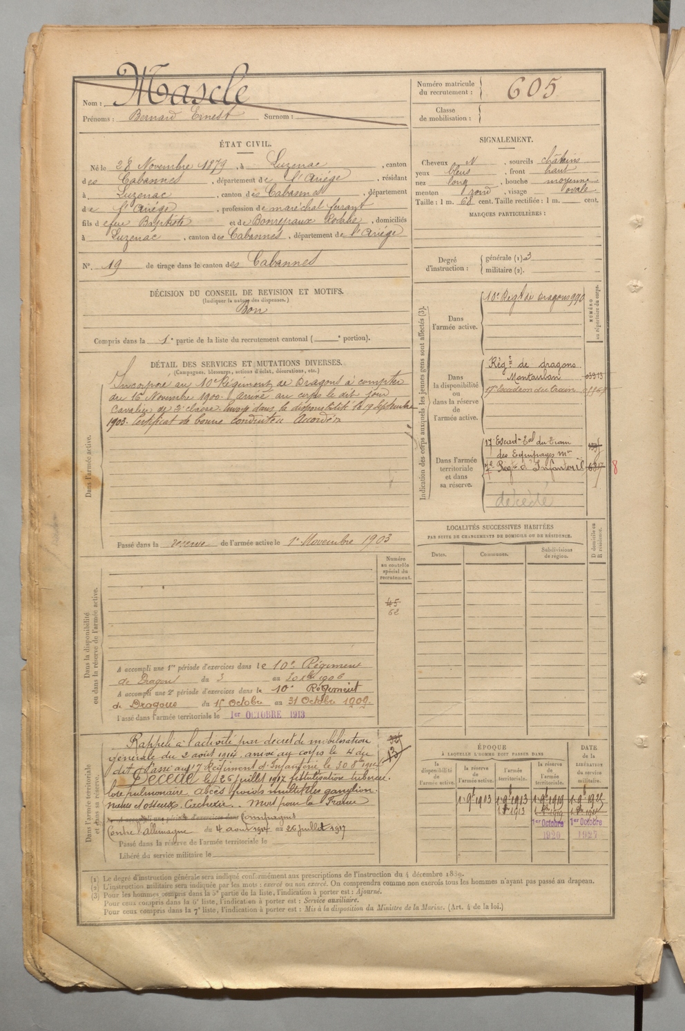| Mascle | Bernard Ernest | FOIX | 1 R 457 | 1899 | Luzenac | Luzenac | 605 |