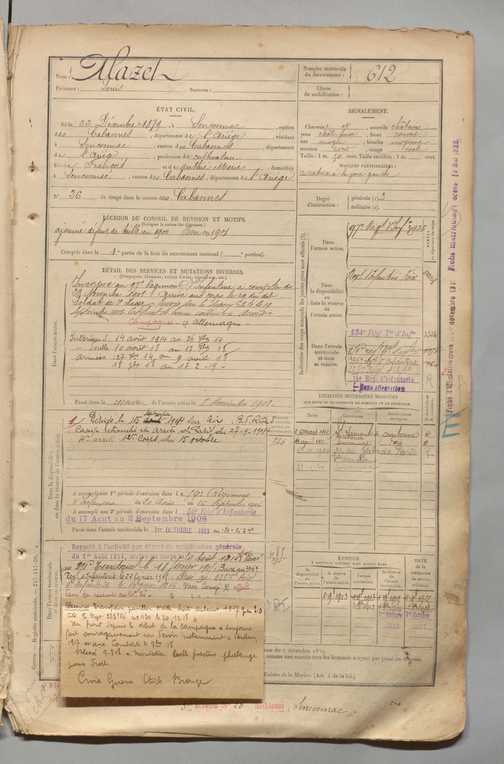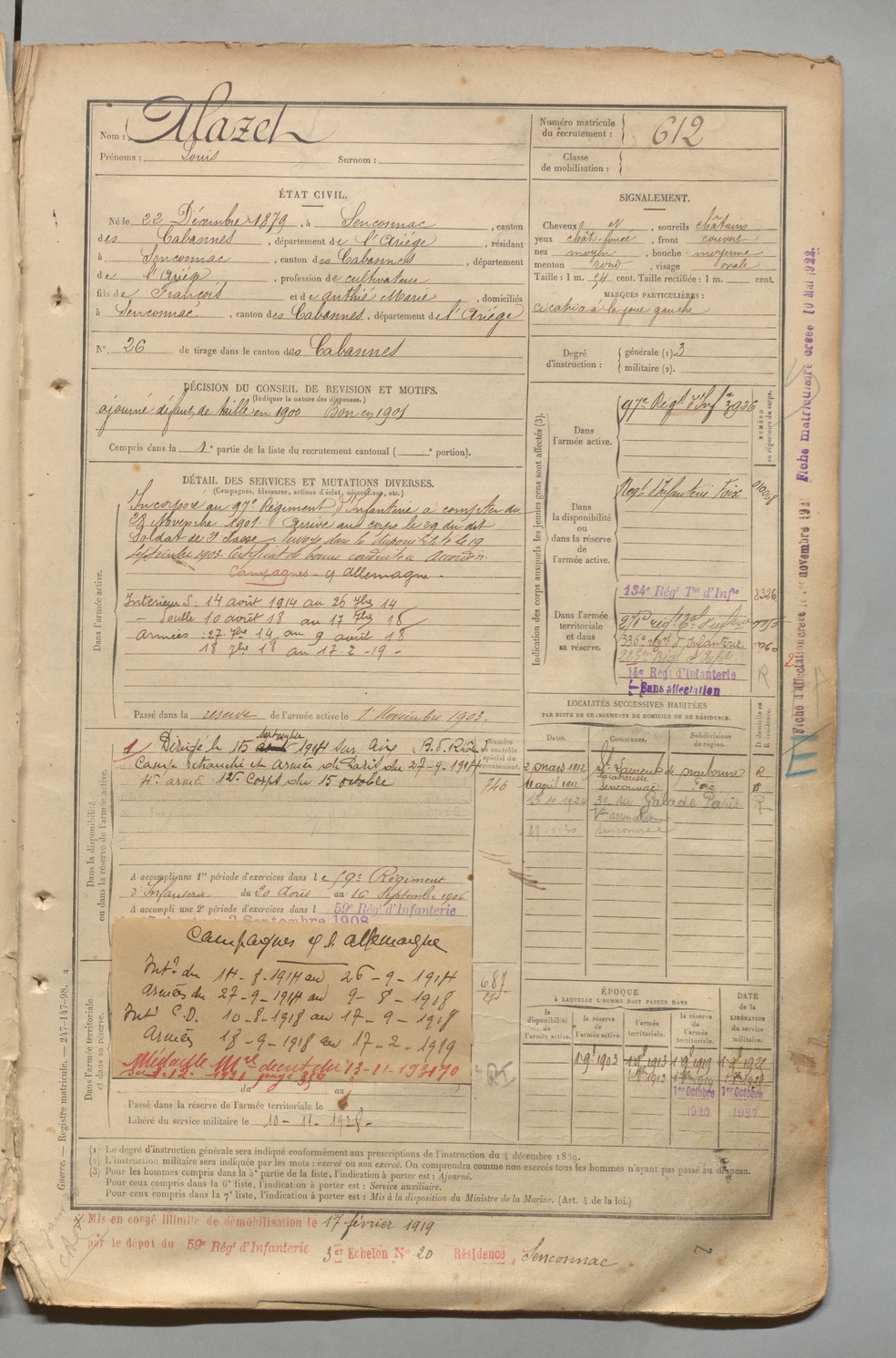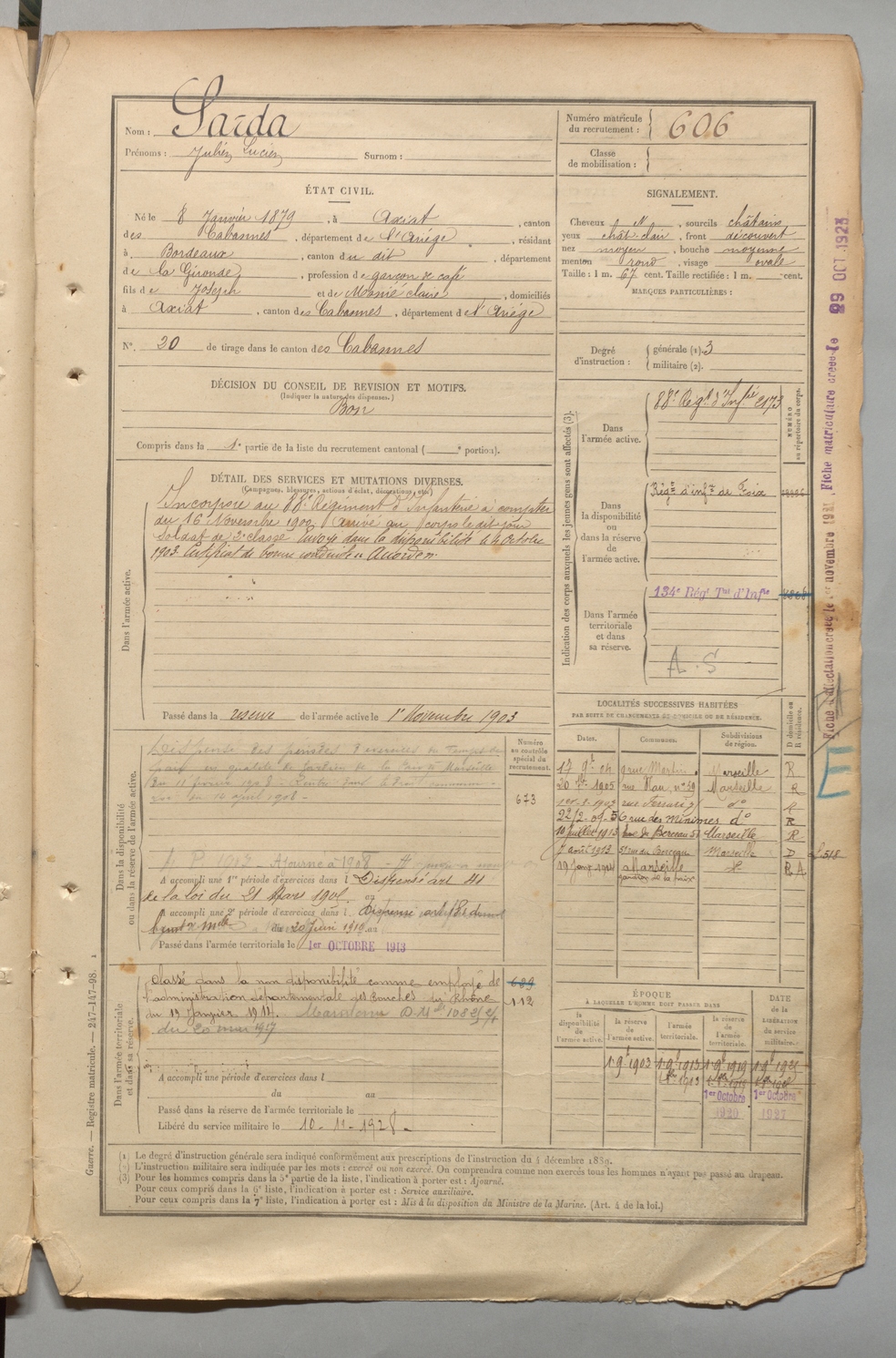 | Sarda | Julien Lucien | FOIX | 1 R 457 | 1899 | Axiat | Bordeaux | 606 |