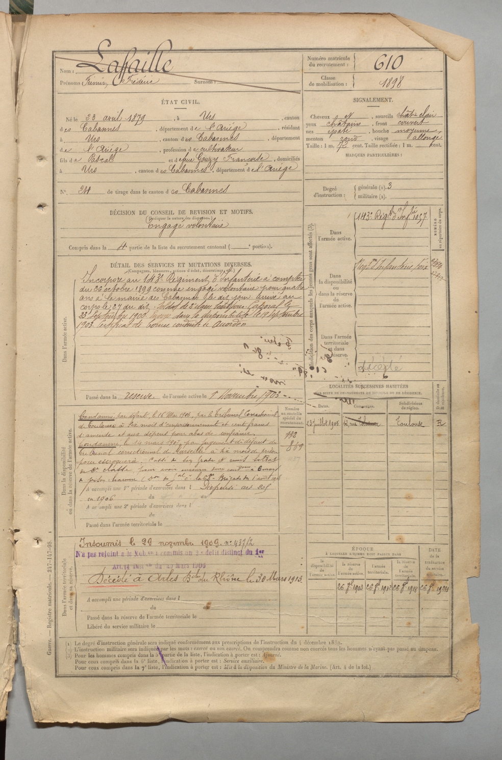 | Laffaille | Firmin Frédéric | FOIX | 1 R 457 | 1899 | Urs | Urs | 610 |