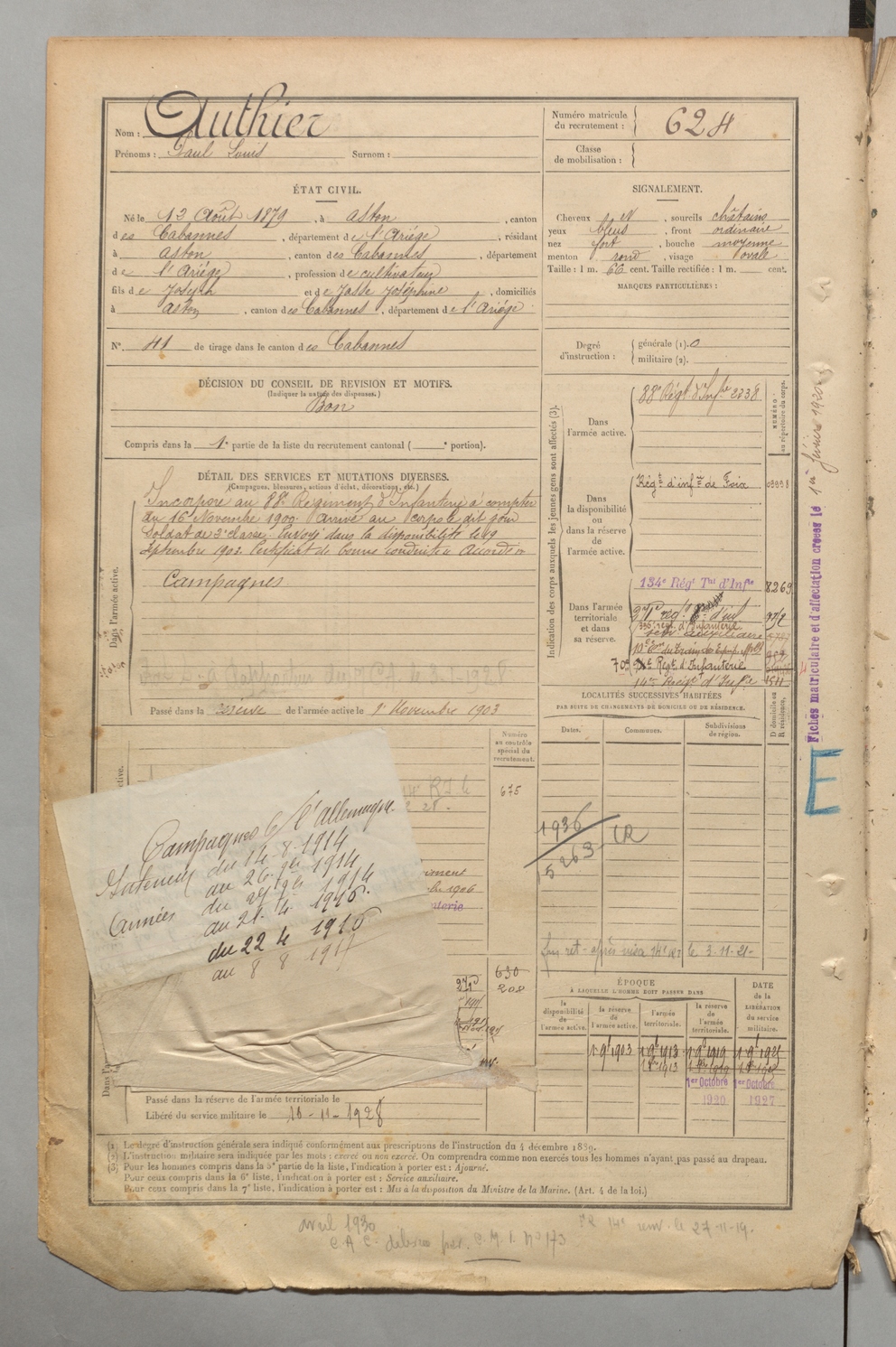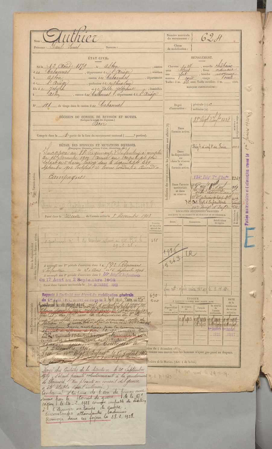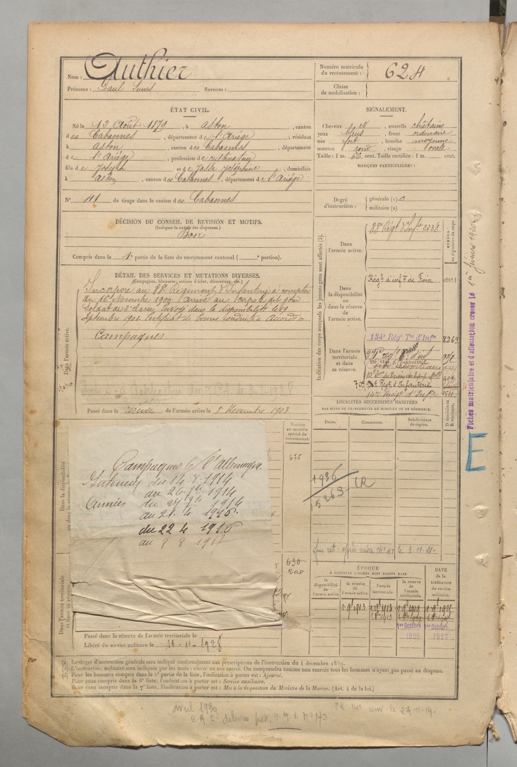 | Authier | Paul Louis | FOIX | 1 R 457 | 1899 | Aston | Aston | 624 |
