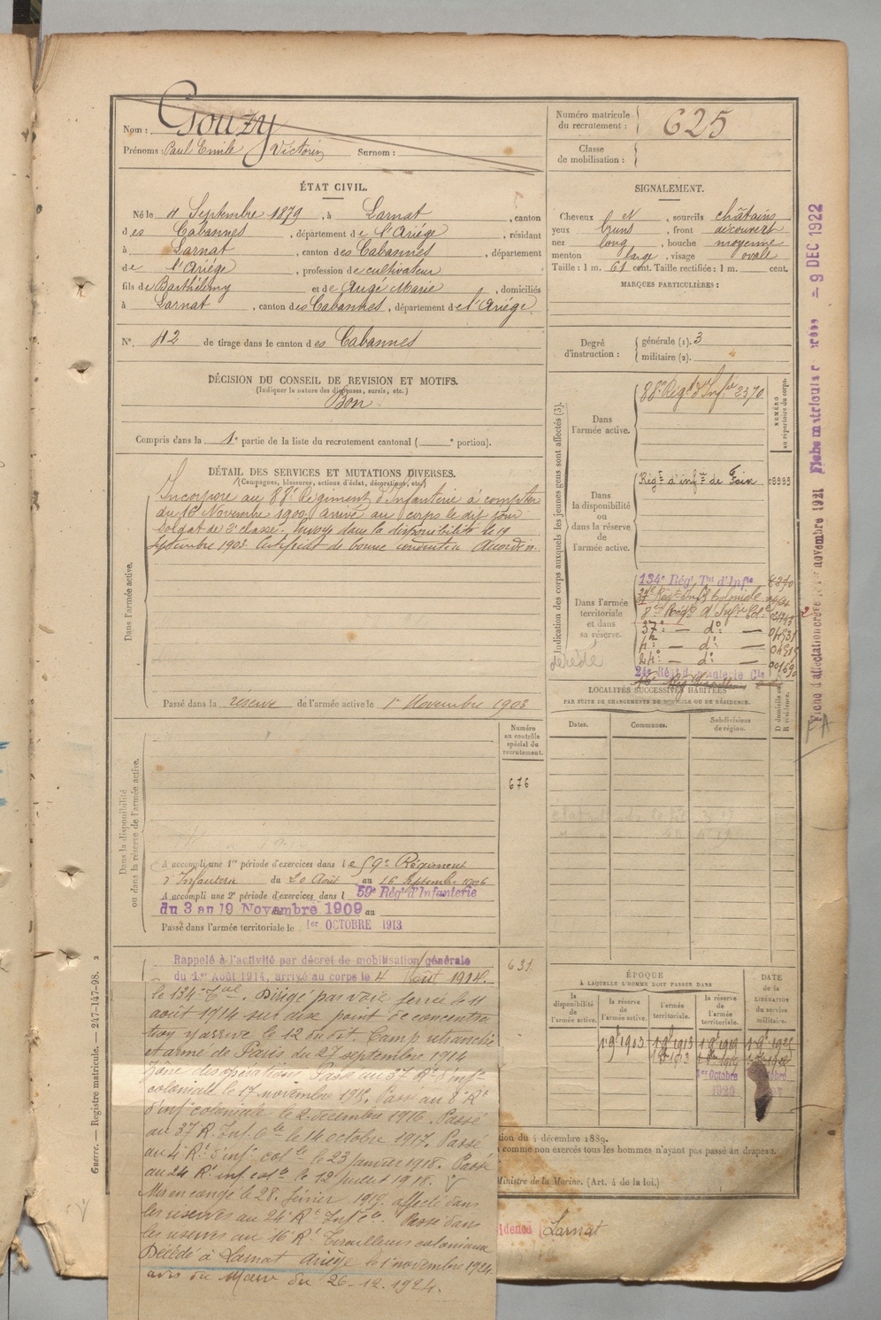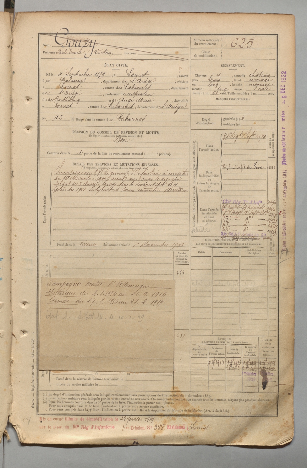 | Gouzy | Paul Emile Victorin | FOIX | 1 R 457 | 1899 | Larnat | Larnat | 625 |