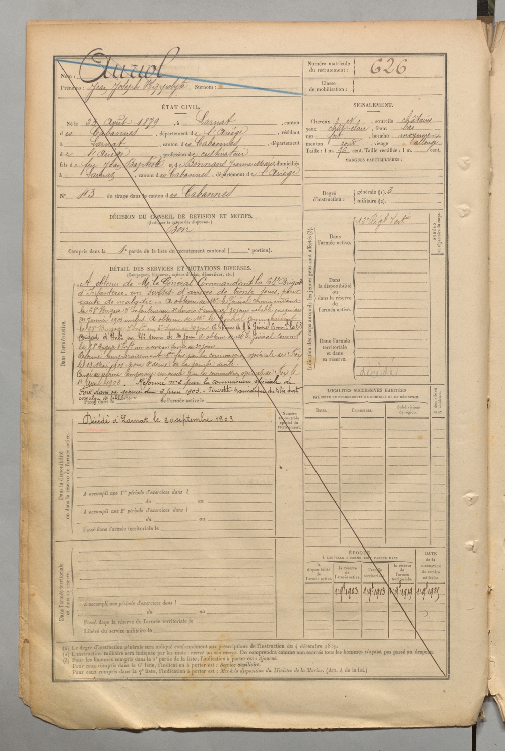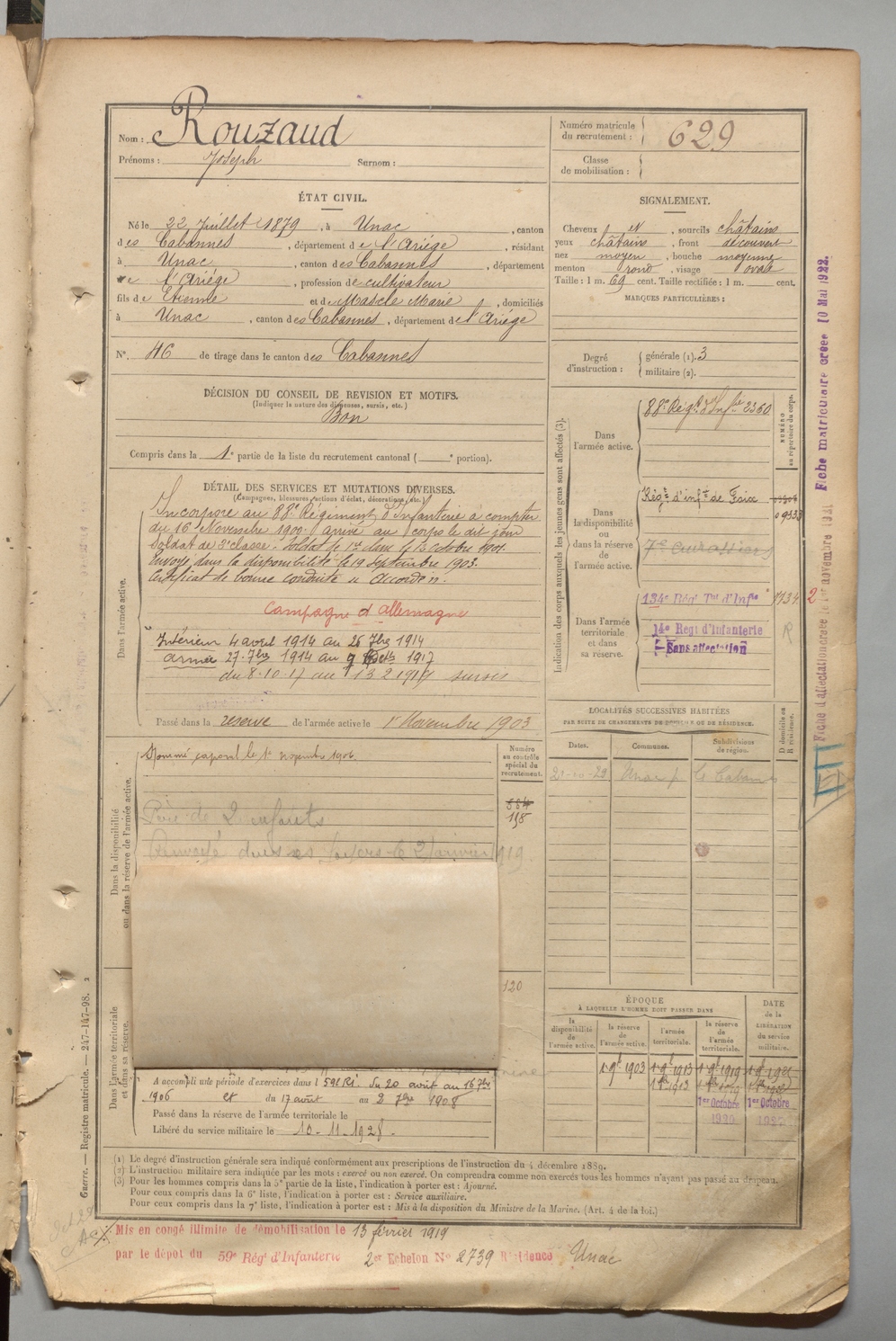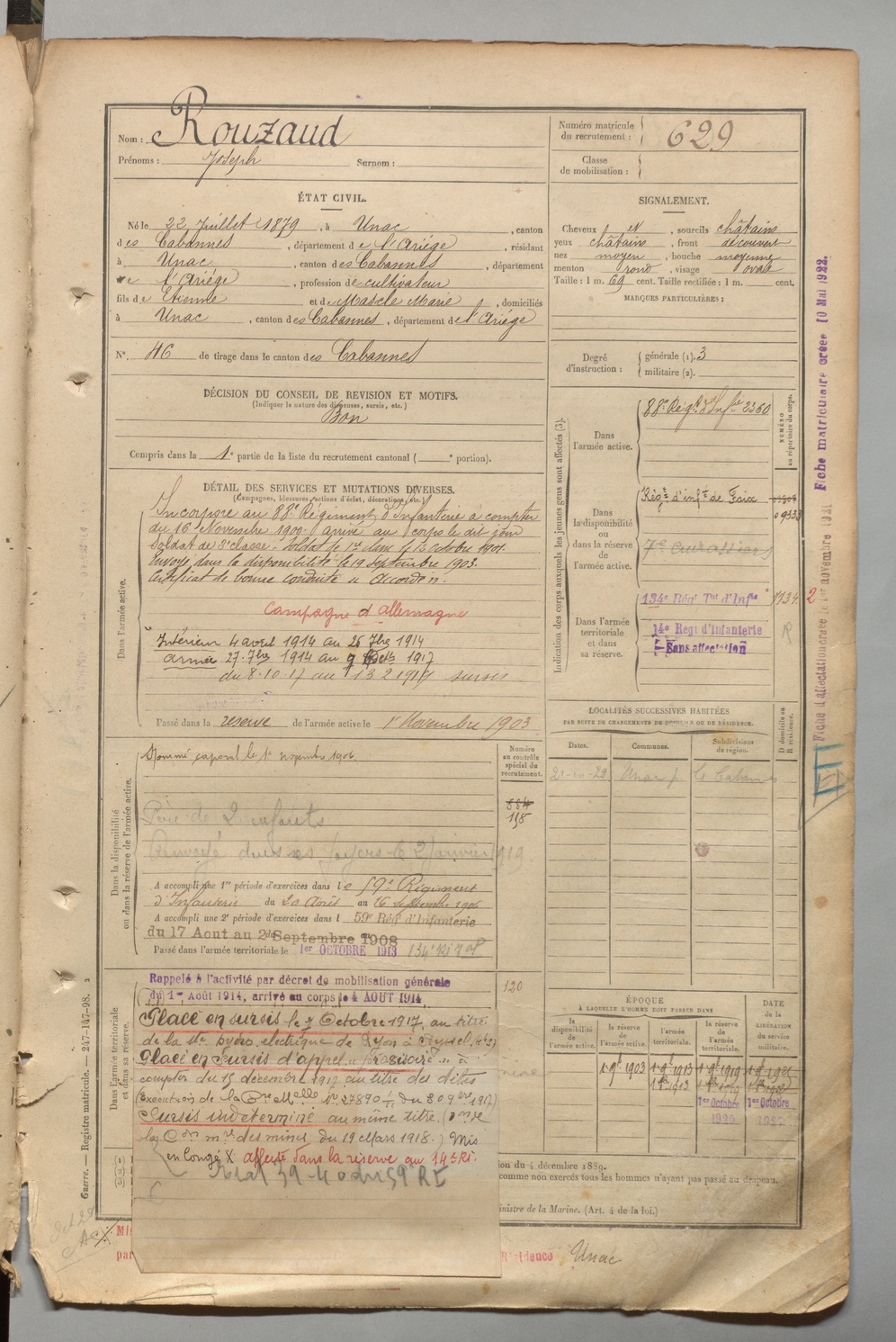 | Rouzaud | Joseph | FOIX | 1 R 457 | 1899 | Unac | Unac | 629 |